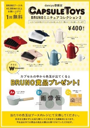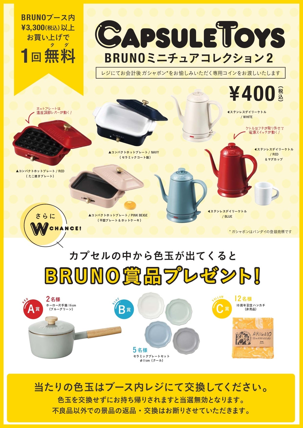 1回400円(税込)で「BRUNOミニチュアコレクション2」がもらえるガシャポン自販機をご用意。抽選でBRUNOの豪華アイテムが当たります!