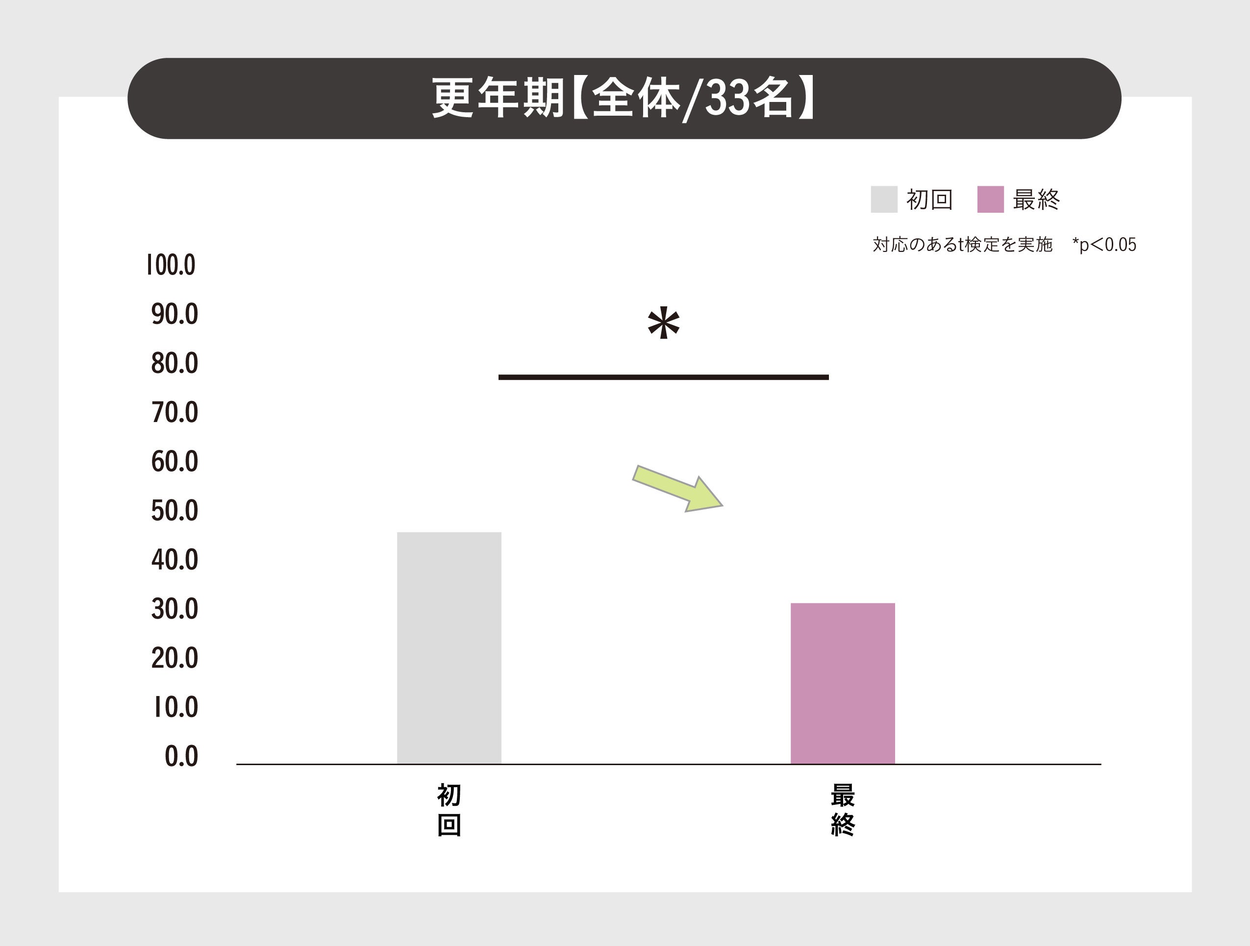 1)全体33名の更年期の10項目の質問に対し、8項目が有意に変化!
