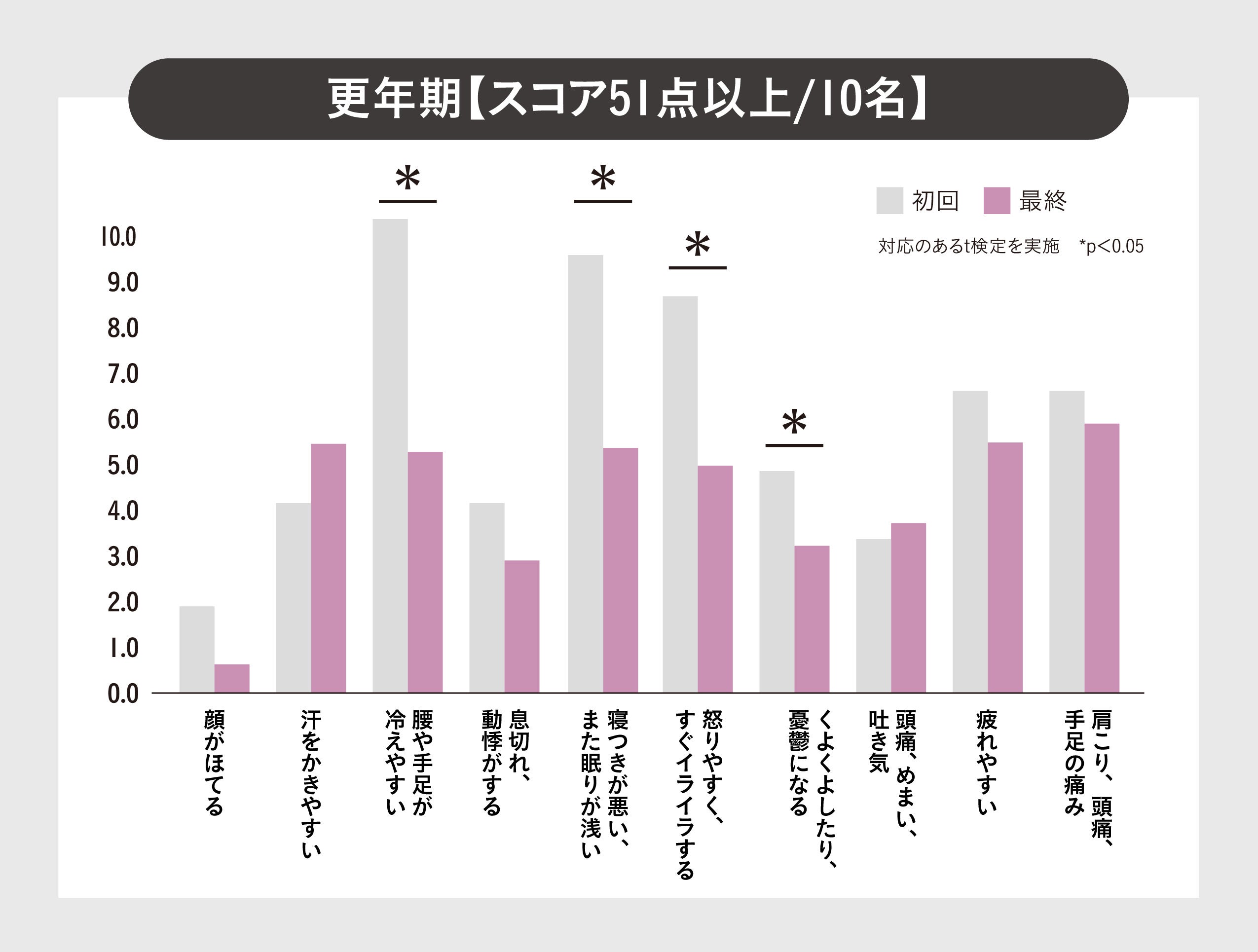 更年期に関する10項目の質問のうち、「腰や手足が冷えやすい」、「息切れ、動悸がする」、「寝つきが悪い、また眠りが浅い」、「怒りやすく、すぐイライラする」、「くよくよしたり、憂鬱になることがある」、「頭痛、めまい、吐き気」、「疲れやすい」、「肩こり、頭痛、手足の痛みがある」の8項目が有意に変化しました。