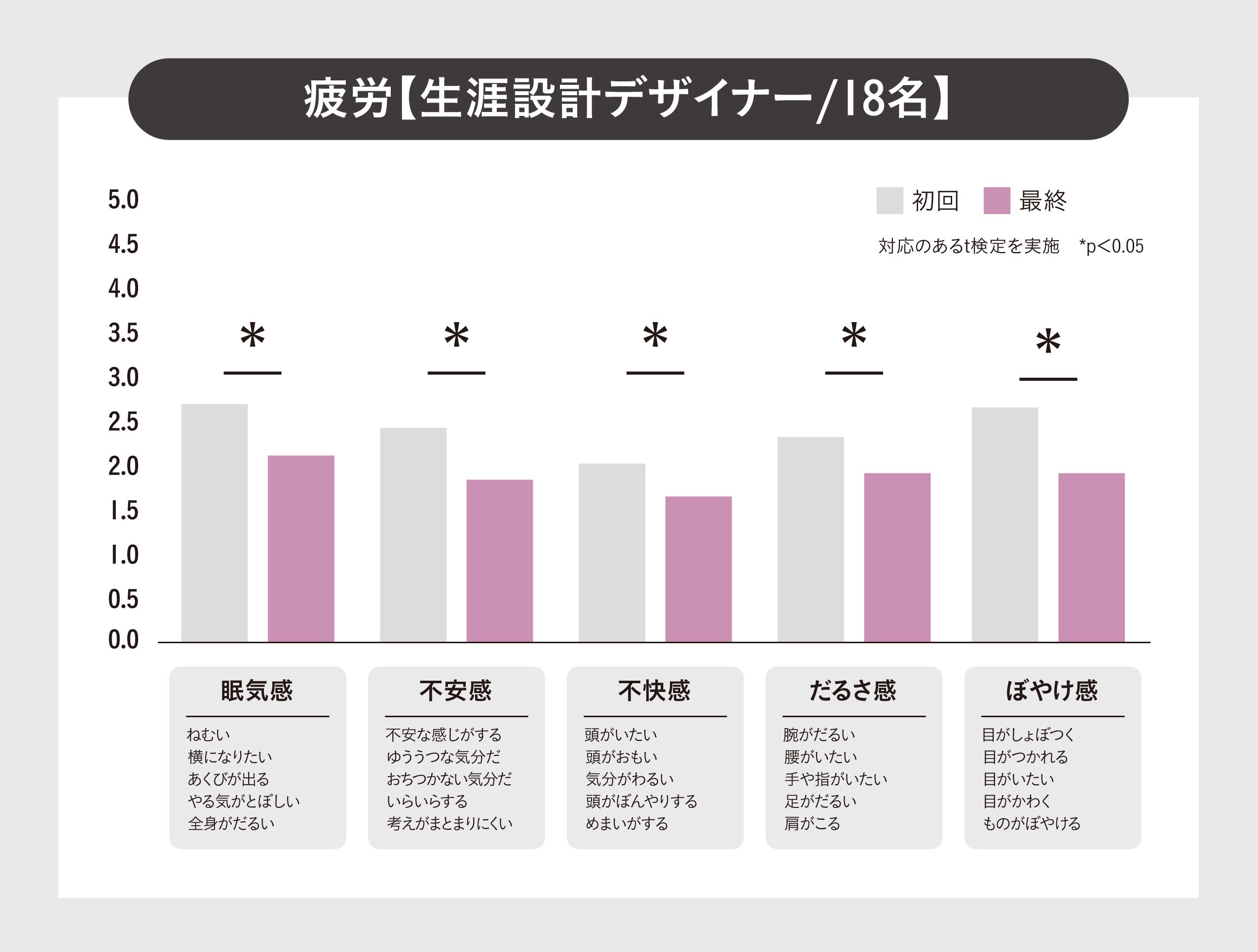 勤務中に移動なども多く身体的疲労度が比較的高い営業職の生涯設計デザイナーでは、各群の「眠気感」、「不安感」、「不快感」、「だるさ感」、「ぼやけ感」の5項目全てが有意に変化しました。勤務中に移動や対面の業務等で疲労度の高い営業職の疲労感が軽減したことにより、パフォーマンス向上が期待できる結果となりました。