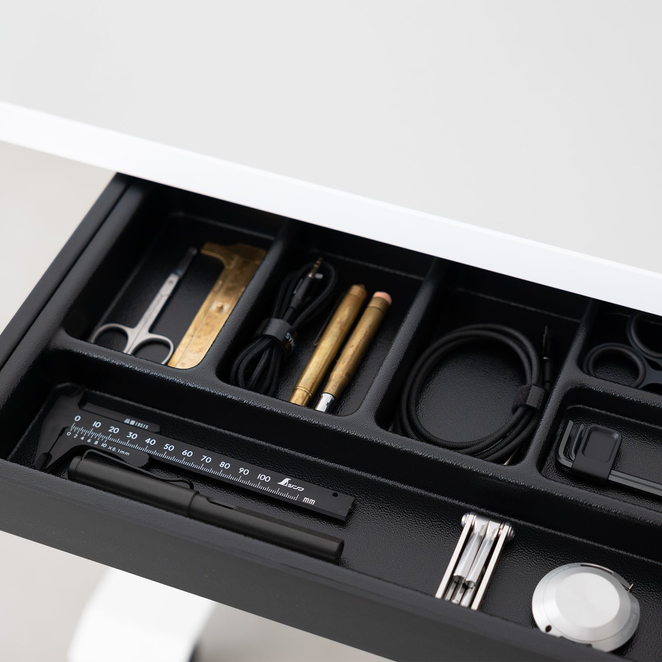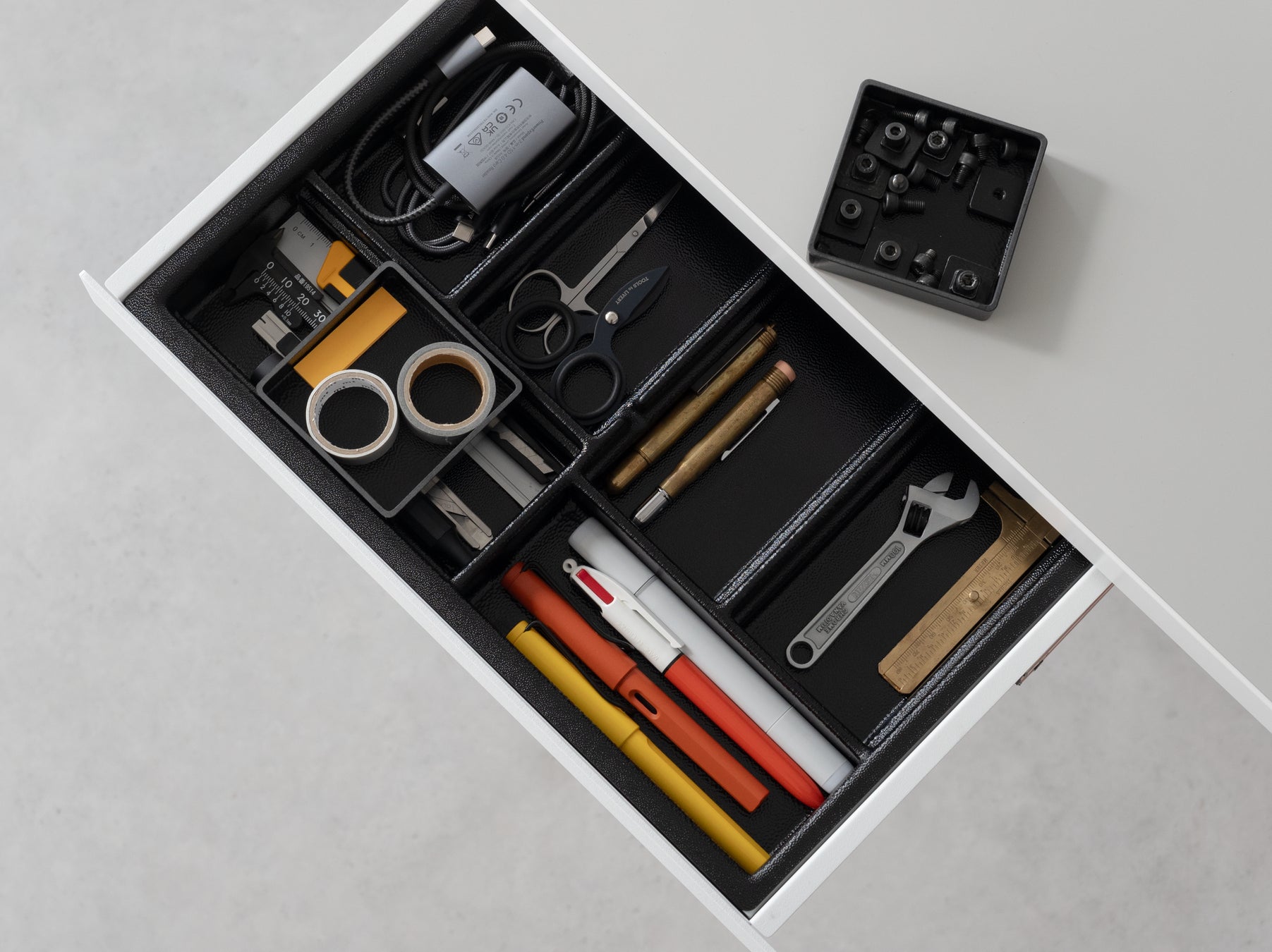 文具やケーブル、ガジェットからクリップ、付箋、ネジといった細々したものにいたるまで、5cmほどの厚みながら、空間を最大限活用しデスク周りの小物をきれいに収納できます。