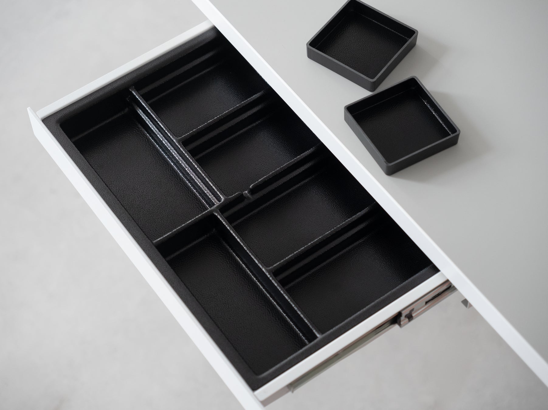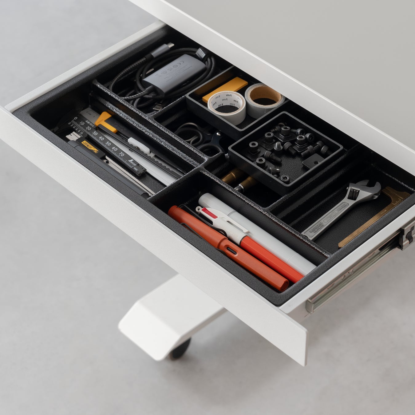 Drawer Mini 2に付属する「Drawer Inner Tray」は、当社のDrawer Mini、Drawer Threeシリーズに合わせて設計した引き出し用トレイです。内部を4サイズ6室に分割し、それぞれのサイズに合わせ、仕事道具の定位置を作れます。