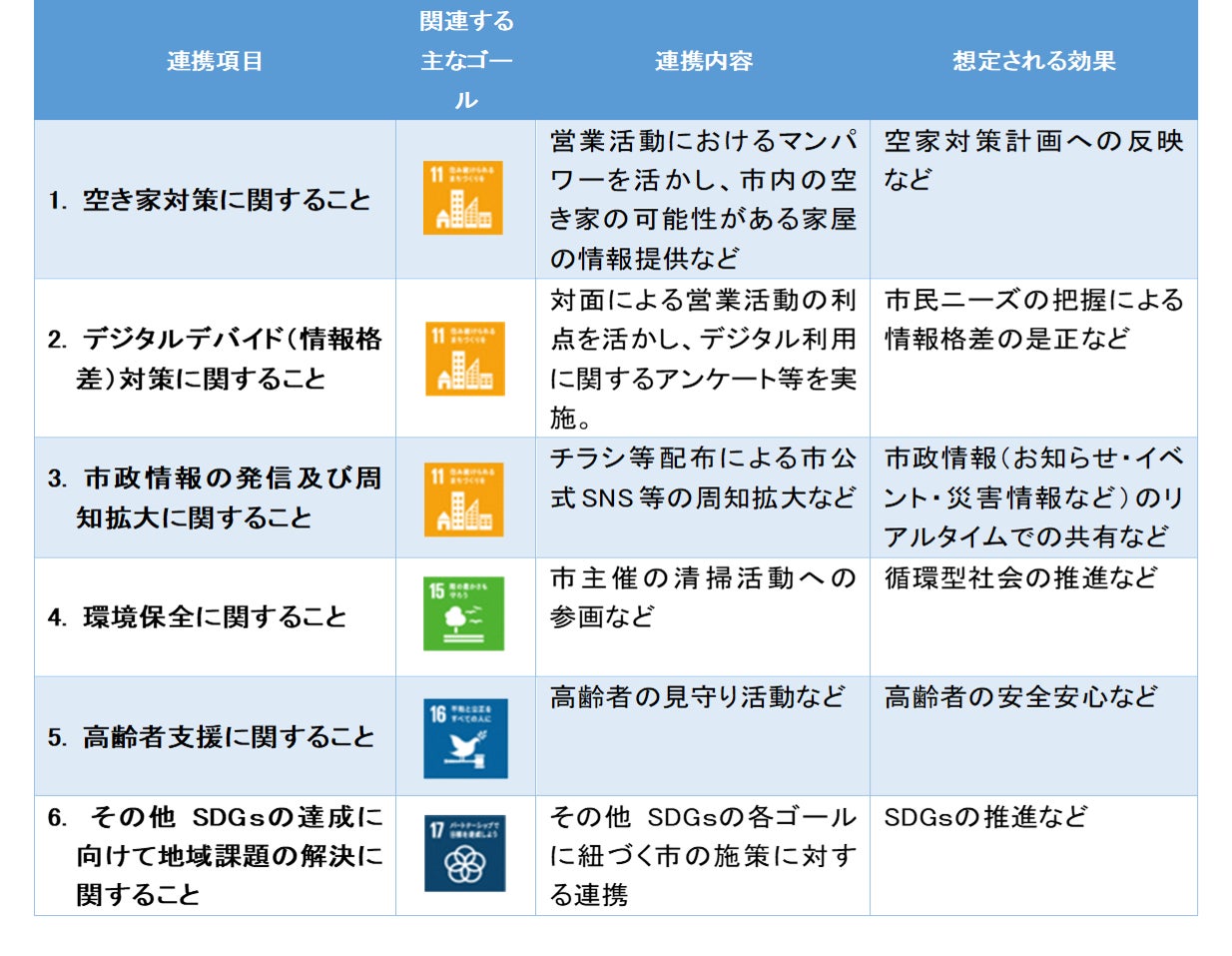 第一生命保険株式会社では、お客様第一主義を理念に掲げ、自治体や企業と連携して地域課題の解決や、SDGs推進にも取り組んでいます。この包括連携では、同社営業職員のマンパワーを活かした空き家の可能性がある家屋の情報提供を空き家対策計画へつなげるとともに、デジタルデバイド(情報格差)対策に関するアンケートを行い市民ニーズの把握につなげるなど、地域課題の解決に向けて取り組みを行っていきます。