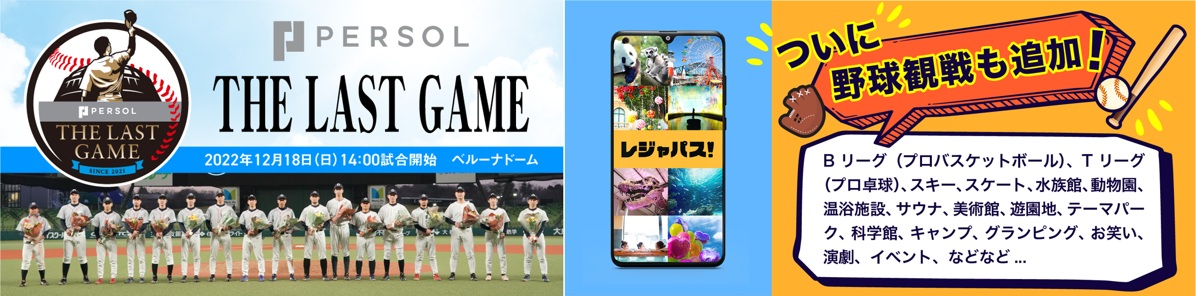 日本最大(※)のエンタメ定額制遊び放題サービス「レジャパス」を提供する株式会社ORIGRESS PARKS(本社:東京都品川区、代表取締役社長:吉武優)は、スカパー!と連携し、12月18日(日)に埼玉県・ベルーナドームで開催される「PERSOL THE LAST GAME 2022」の観戦予約を開始しました。