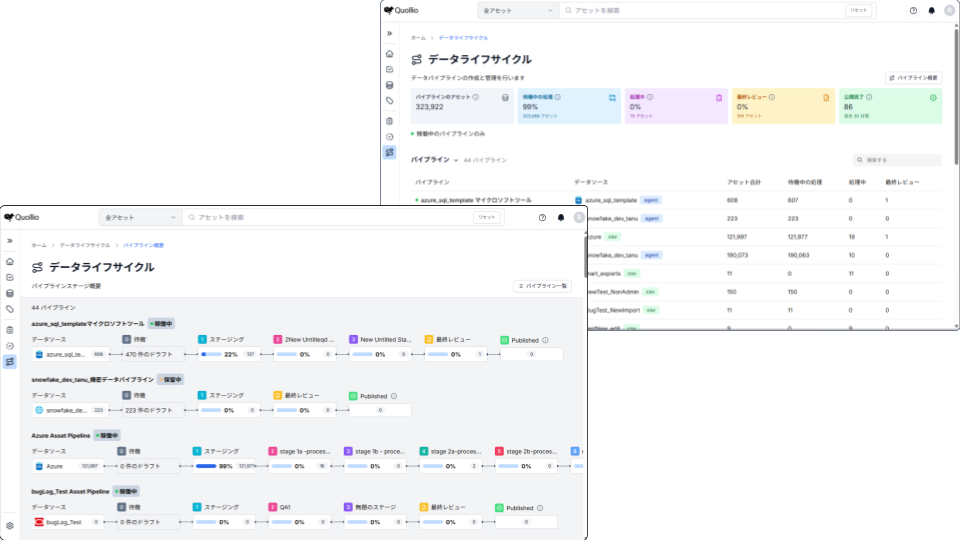 新規データソース登録時にパイプラインが自動生成され、ステージの順序や各ステージのレビュアー割り当てを柔軟にカスタマイズ可能。 -
