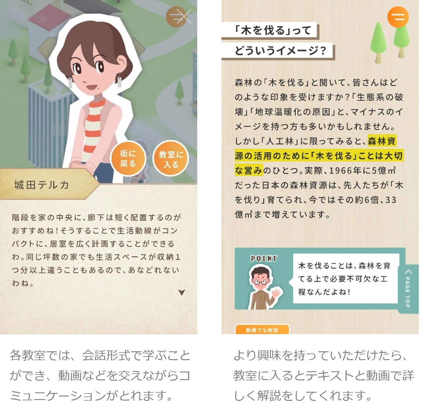 また、日本の森林資源の実情や林業のしくみ、国産材の魅力についてゲーム感覚で学び、持続可能な住まいとしての木の住まいの魅力や森林サイクルにむけた当社の取組みを解説しています。