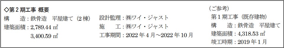 このたび竣工した第2期工事は、設計監理及び施工をヤマダホールディングスグループの株式会社ワイ・ジャスト様にお願いし、2021年5月12日付「中期経営計画の策定について」及び2021年5月21日付「『関東物流センター』第2期工事の再開及び首都圏物流網再構築に関するお知らせ」にて開示いたしました通り、既存の1棟に加え、2棟の倉庫を新設したものです。同センターでは、首都圏物流におけるストックヤード機能の中核として、首都圏全体を見据えた木材製品の保管を集約し、市場競争力及び収益力の強化を目指します。また、木材製品のアッセンブル機能などを新たに付加することで、プレカット工場等への広域配送における優位性を示すとともに、更なるサービスの向上を図ってまいります。