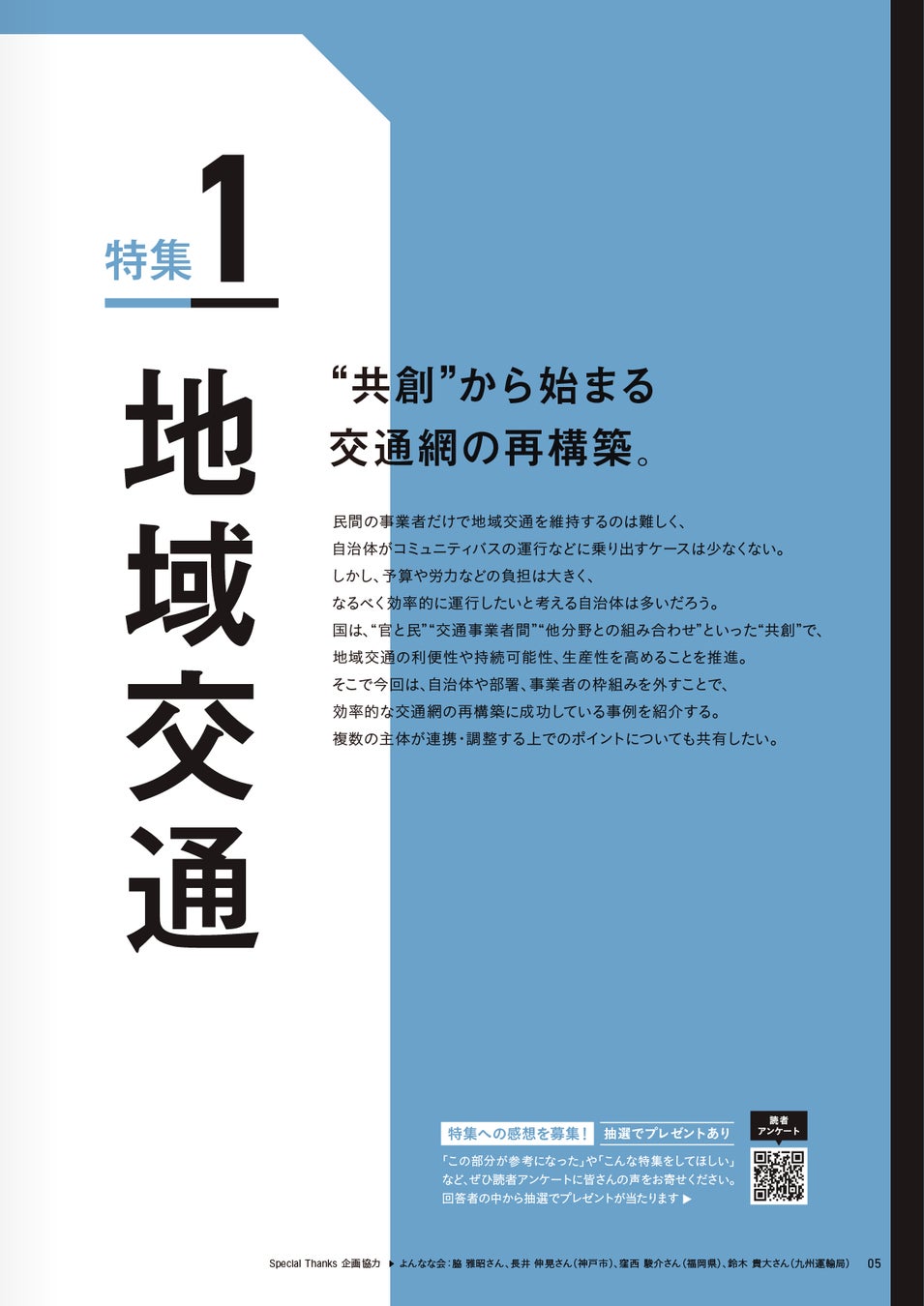 今号の特集1では、「[地域交通]“共創”から始まる交通網の再構築。」をテーマに、熊本県、熊本県熊本市、滋賀県彦根市、鳥取県伯耆町(ほうきちょう)などの事例をご紹介しております。特集2では、「[行政デジタル化]失敗しても諦めず改善を重ねて成功へ。」をテーマに、東京都、宮崎県都城市、埼玉県深谷市などの取り組みをご紹介しております。