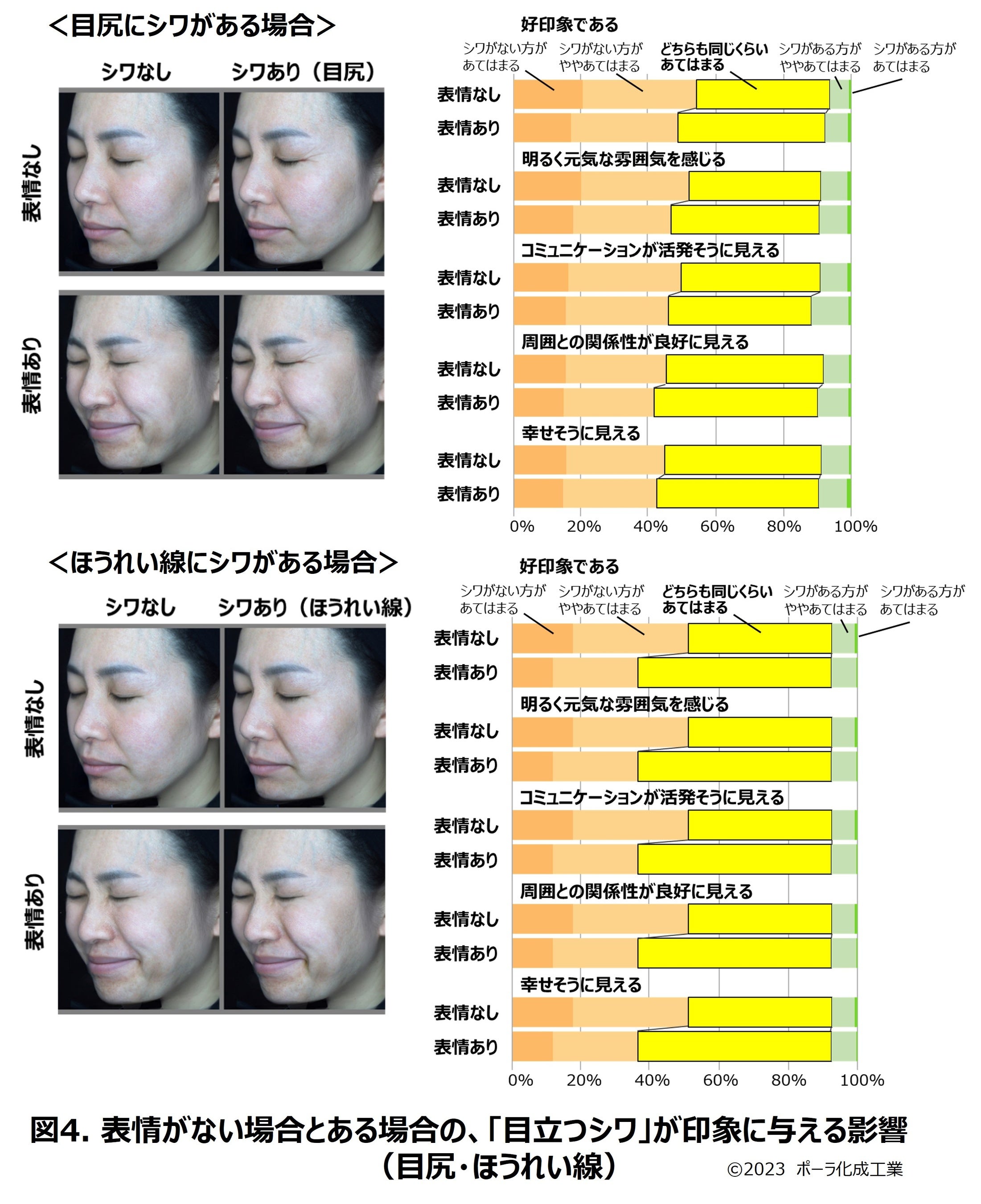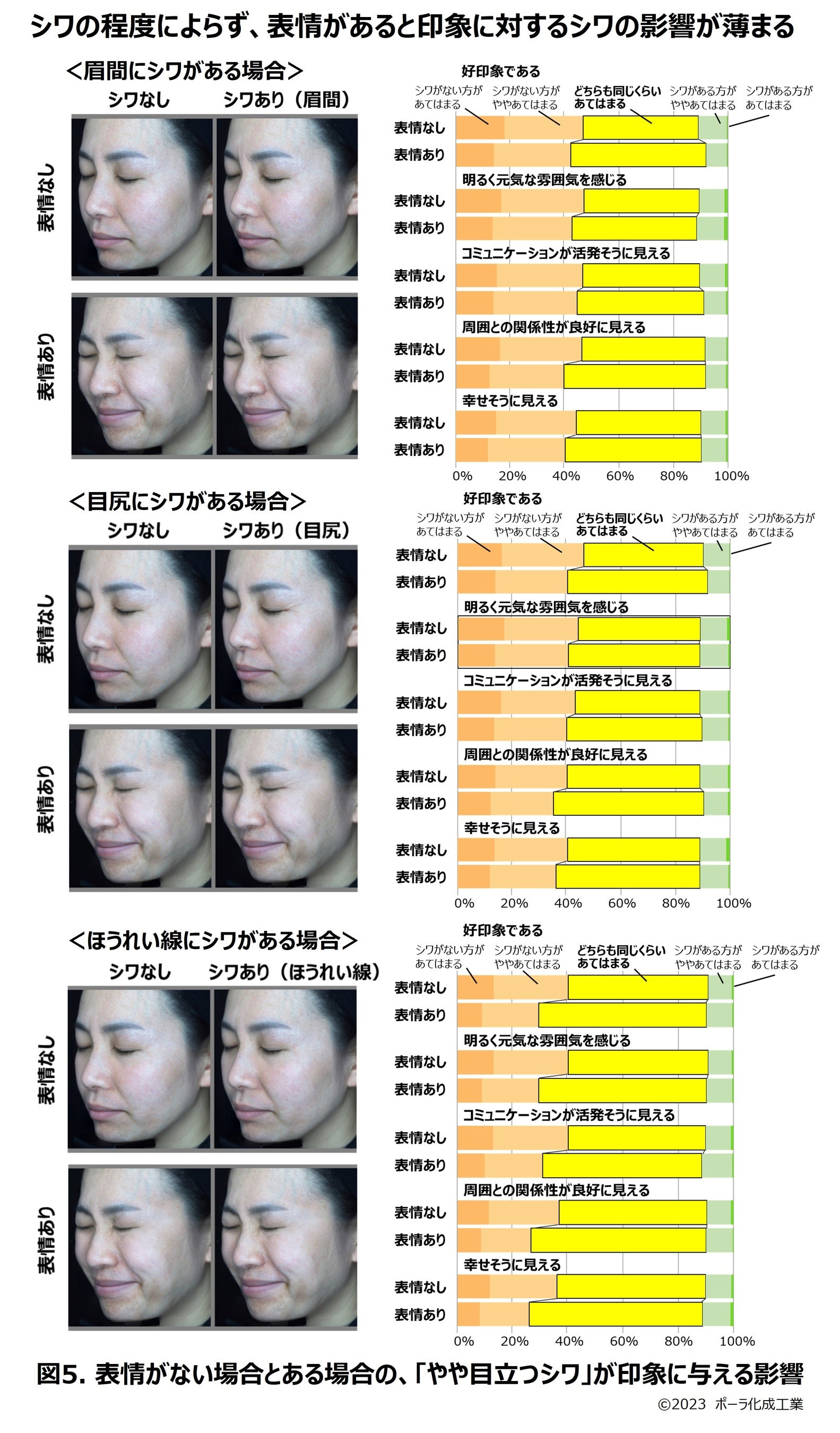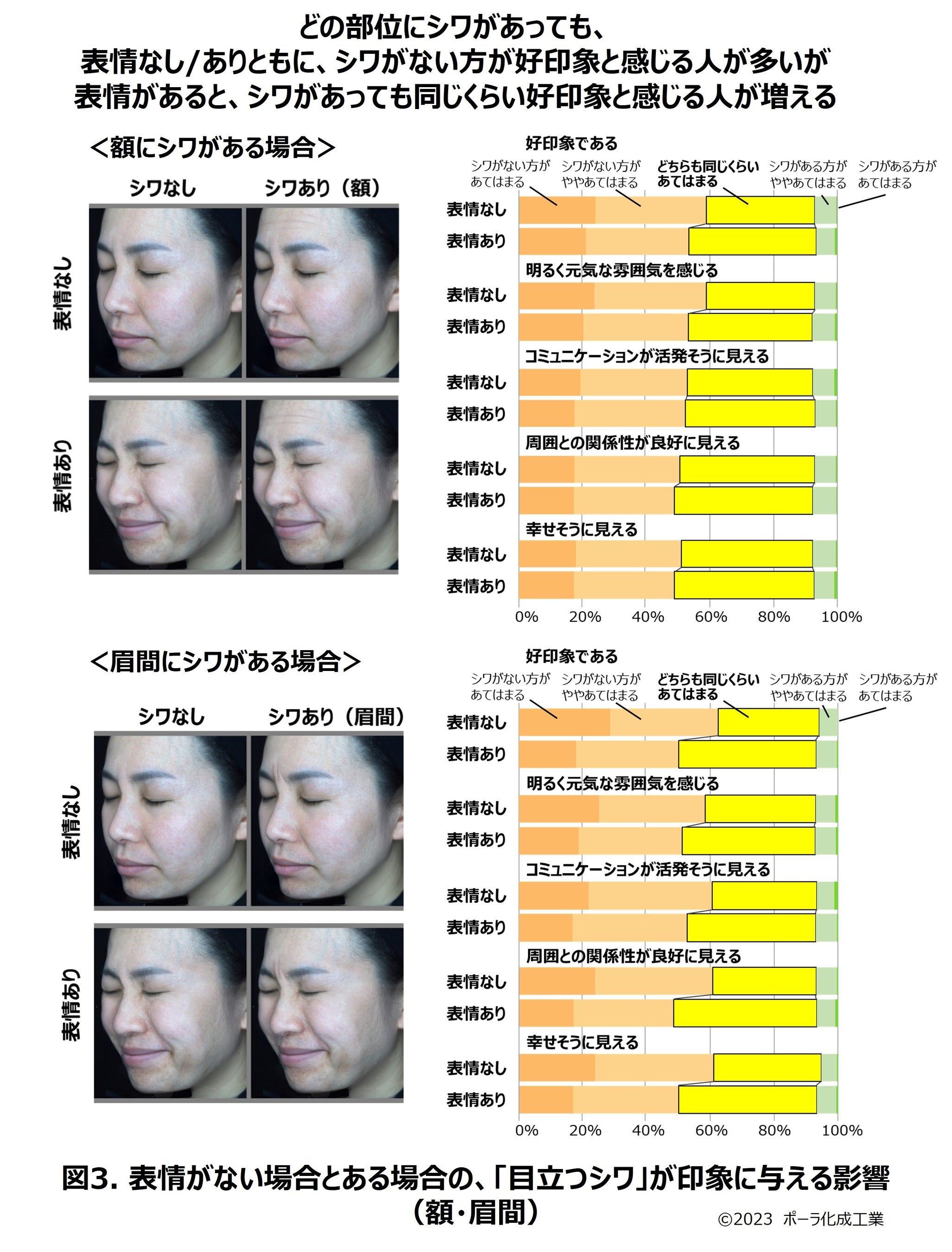 また、表情のある場合はない場合と比べて、どの部位のシワについても、各印象について「どちらも(シワがない画像もある画像も)同じくらいあてはまる」と回答した人が多いことが分かりました。