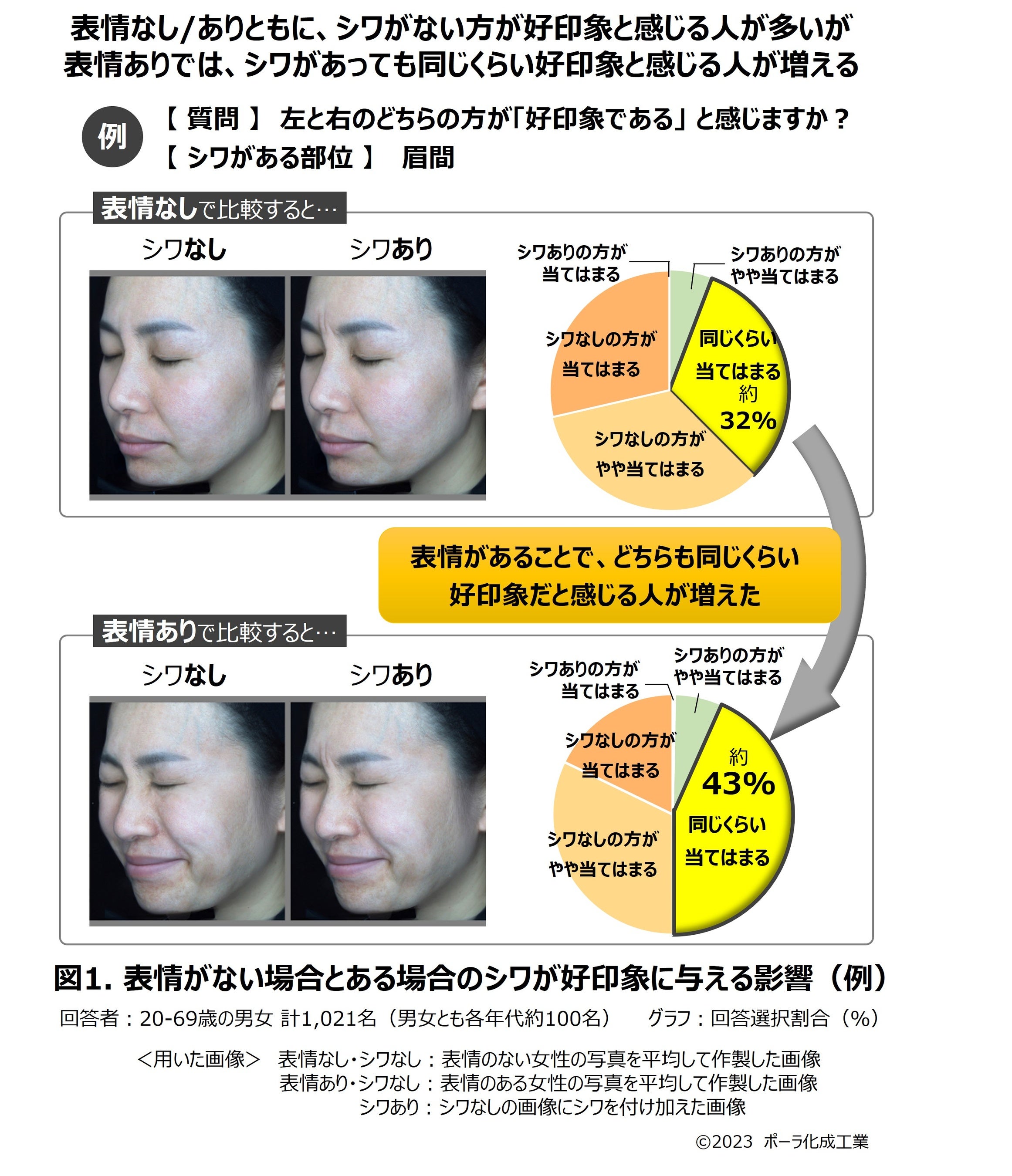 試験では、ウェブ上で全国の20~60代の男女約1,000名に、表情がなくシワのない画像とシワを加えた画像を見比べてもらい、どちらの方が「好印象である」と感じるか質問しました。また、表情がありシワのない画像とシワを加えた画像についても同様の質問を行いました。シワを加えた部位やシワの形・濃さはどちらも同じです。得た回答をもとに、表情の有無で結果に差があるかを解析しました(補足資料1)。