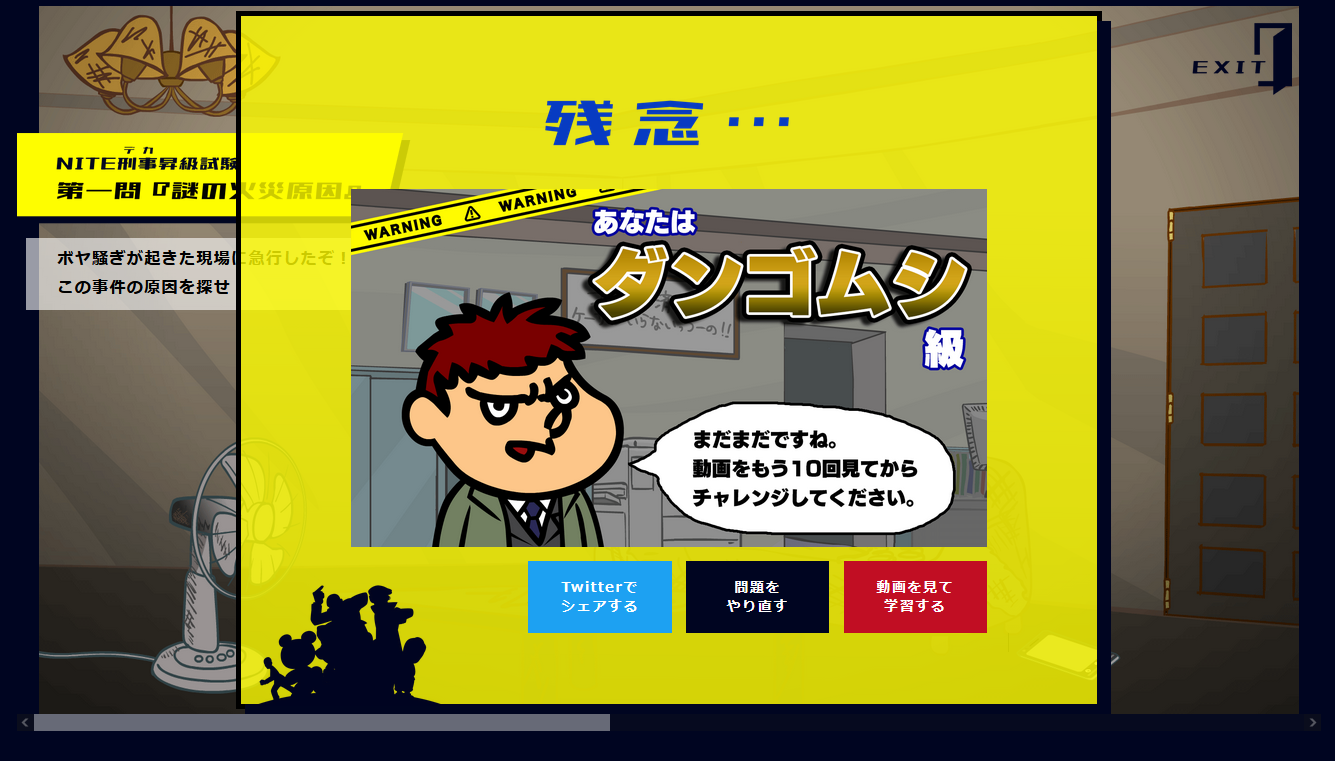 第2弾となる特設サイトでは、これらの動画に関連したゲーム「NITE刑事昇進試験」を掲載しました。 NITE刑事昇進試験では、NITEの職員(NITE刑事)になった気分で、NITEの業務の一部を体験でき、生活の安全や未来への挑戦を支えるためにNITEがどんなことをしているのか、楽しみながら理解することができます。