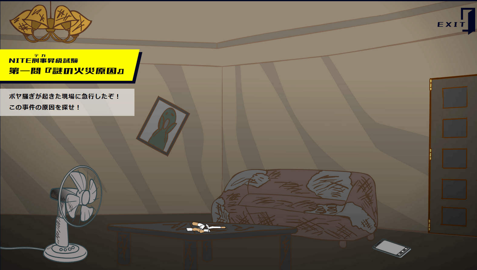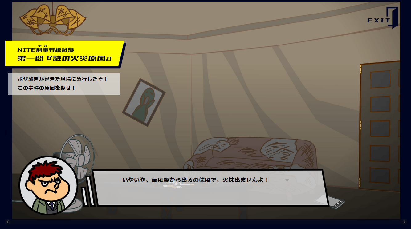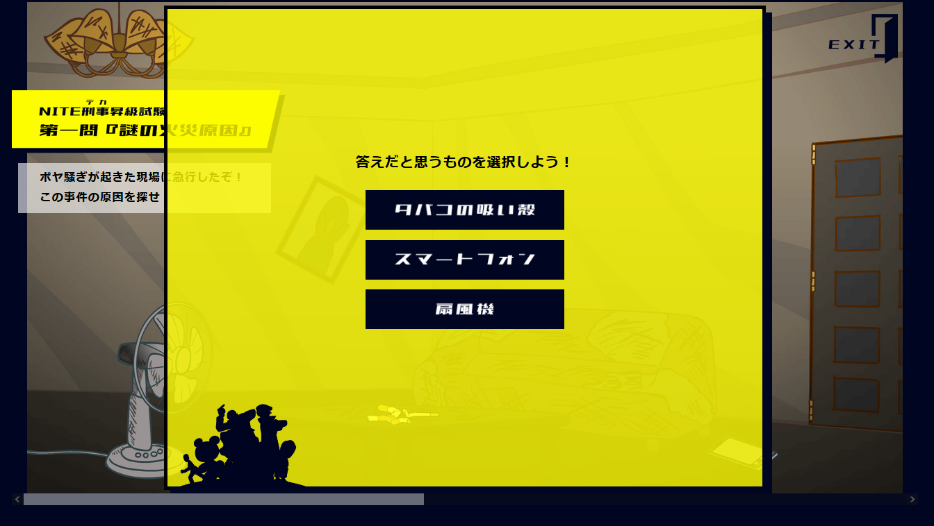 第1問では、製品安全センターのNITE刑事になっていただき、火災の原因を調査していただきます。