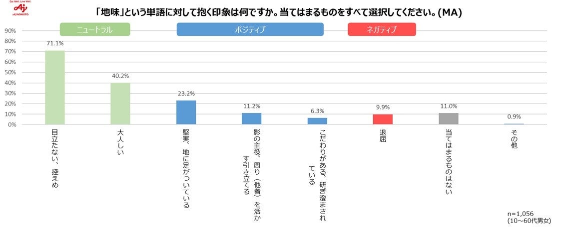 最後に、「地味」という言葉に対して抱く印象について調査したところ、既存のイメージである「目立たない、控えめ」が71.1%とトップでしたが、「堅実、地に足がついている」(23.2%)「影の主役、周り(他者)を活かす 引き立てる」(11.2%)と回答する人も一定数おり、「退屈」というネガティブなイメージの回答は9.9%と1割以下でした。「地味」という言葉がポジティブに捉えられていることがうかがえます。