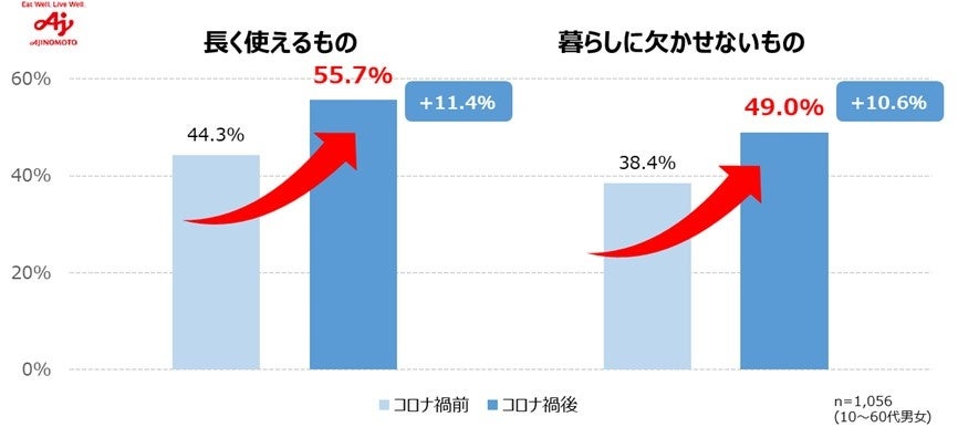 また、最も重要視していることについても、「長く使えるもの」「暮らしに欠かせないもの」がコロナ禍前からコロナ禍後では増加しており、「話題・トレンドのもの」「華やかなもの」は減少しているという同様の結果となりました。