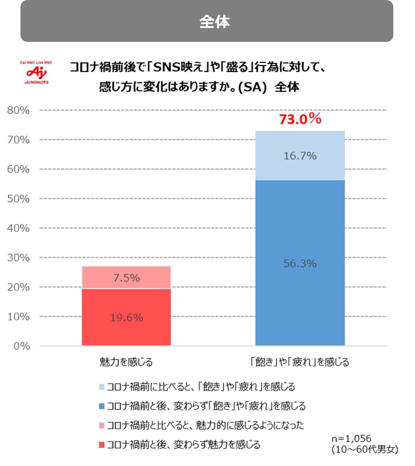 1.SNSでの「映え」や「盛り」に疲れや飽きを感じている人は全体で7割以上となり、若年層女性でも半数以上が同様に感じているという結果に