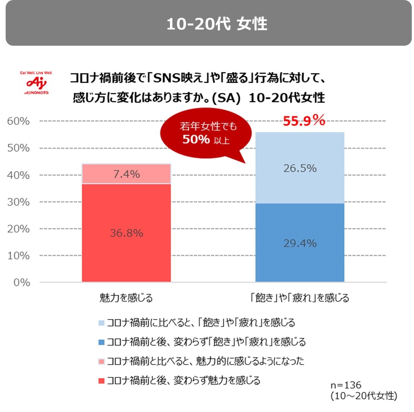 1.SNSでの「映え」や「盛り」に疲れや飽きを感じている人は全体で7割以上、若年層女性(n=136)でも半数以上が同様の回答