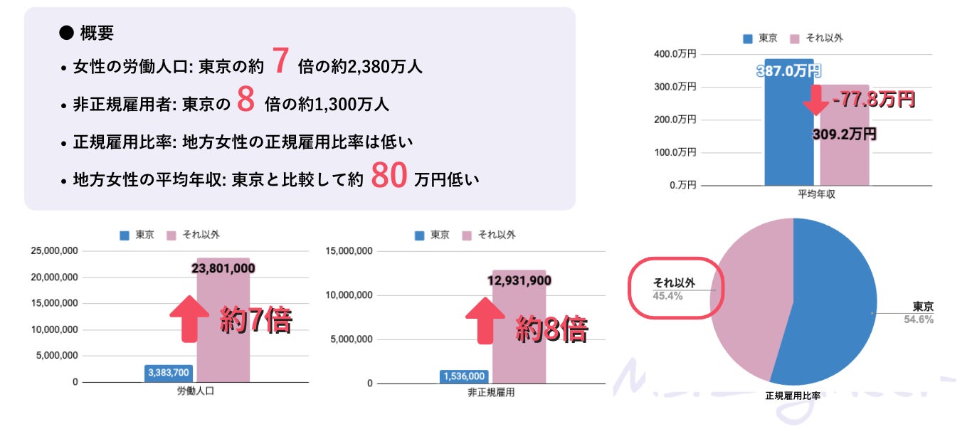 地方女性の労働人口は東京の7倍の2,380万人、平均年収は東京よりも80万円低い「眠れる人材資本」です。Ms.Engineerはオンラインでその後の就職や賃金向上につながる高度なITスキルを身につけられるプログラムですが、地方女性の受講割合が多く、彼女たちが地元でスキルを身につけ、居住地を変えずに稼げる就労機会を得ることを後押しすることで、人口流出の抑止や地域のデジタル化を推進していきたいと考えております。