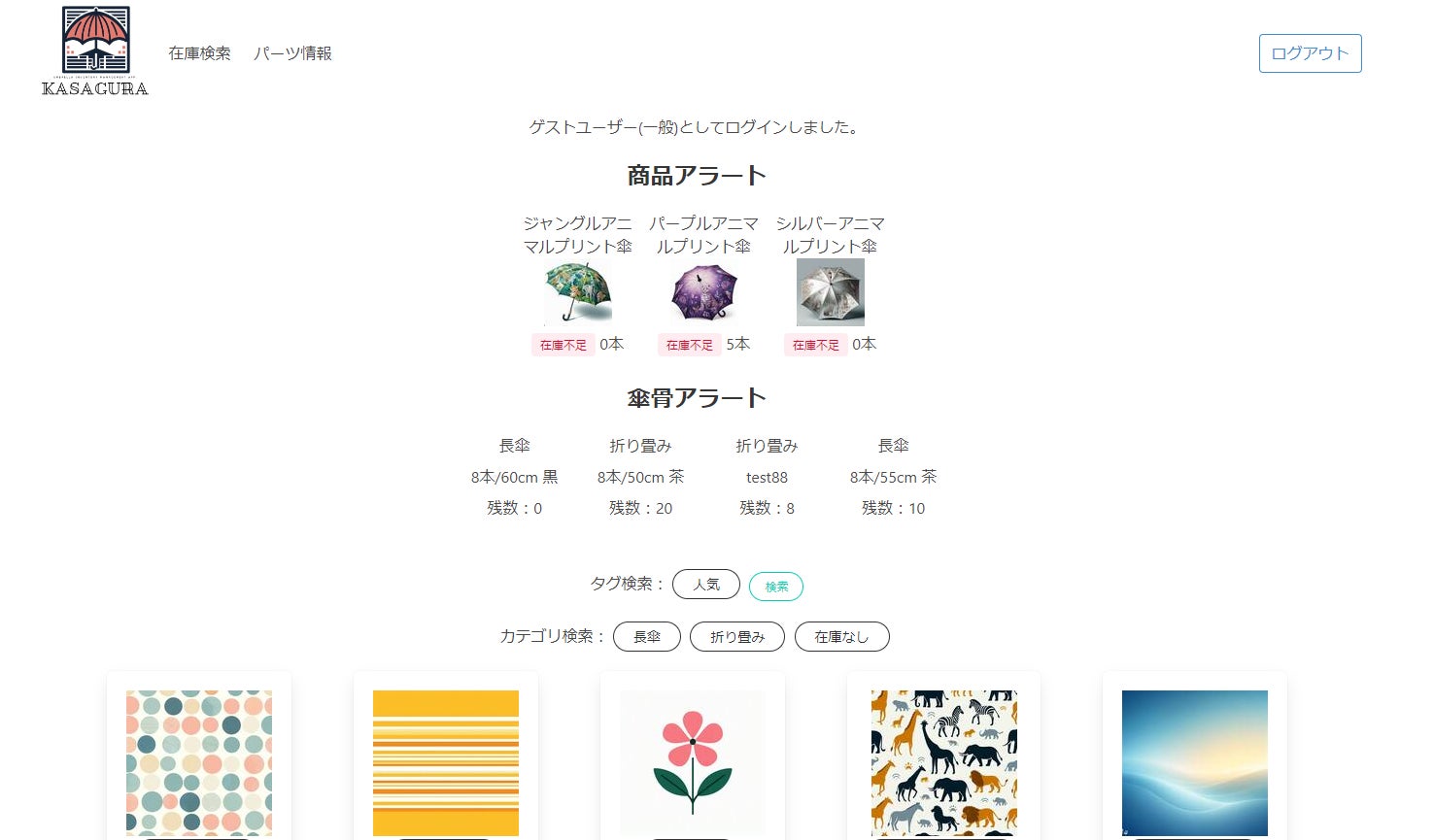 「KASAGURA」はシンプルな操作が特徴の在庫管理システムです。約490種類ある絵柄の傘の製造に必要な材料や、在庫の見える化を行うことによって、製造効率UPに寄与します。LINEでの在庫不足アラート機能なども含め、高齢の方であっても直観的に操作ができるよう工夫が施されていることも特徴の一つです。