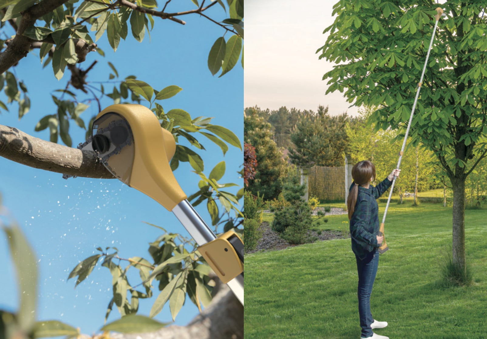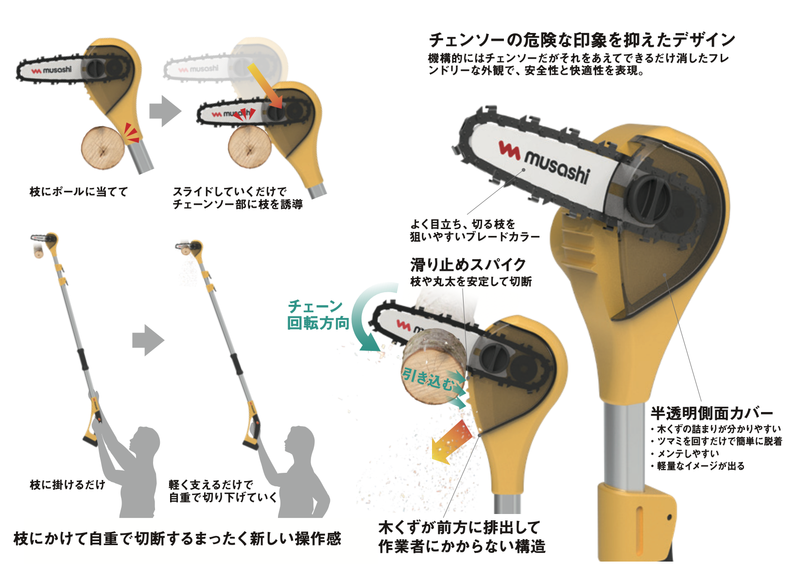 枝にかけて自重で切断する新しい作業感や、木くずが前方に飛ぶ構造による快適な使用性、そして“チェ ンソーの危険な印象”を和らげた安心感のある外観など、随所にユーザー視点の工夫を取り入れました。こ れにより、女性や高齢者でも安全かつ容易に高所の大枝を剪定できるようになり、従来は困難だった作業 の負担を大幅に軽減しています。