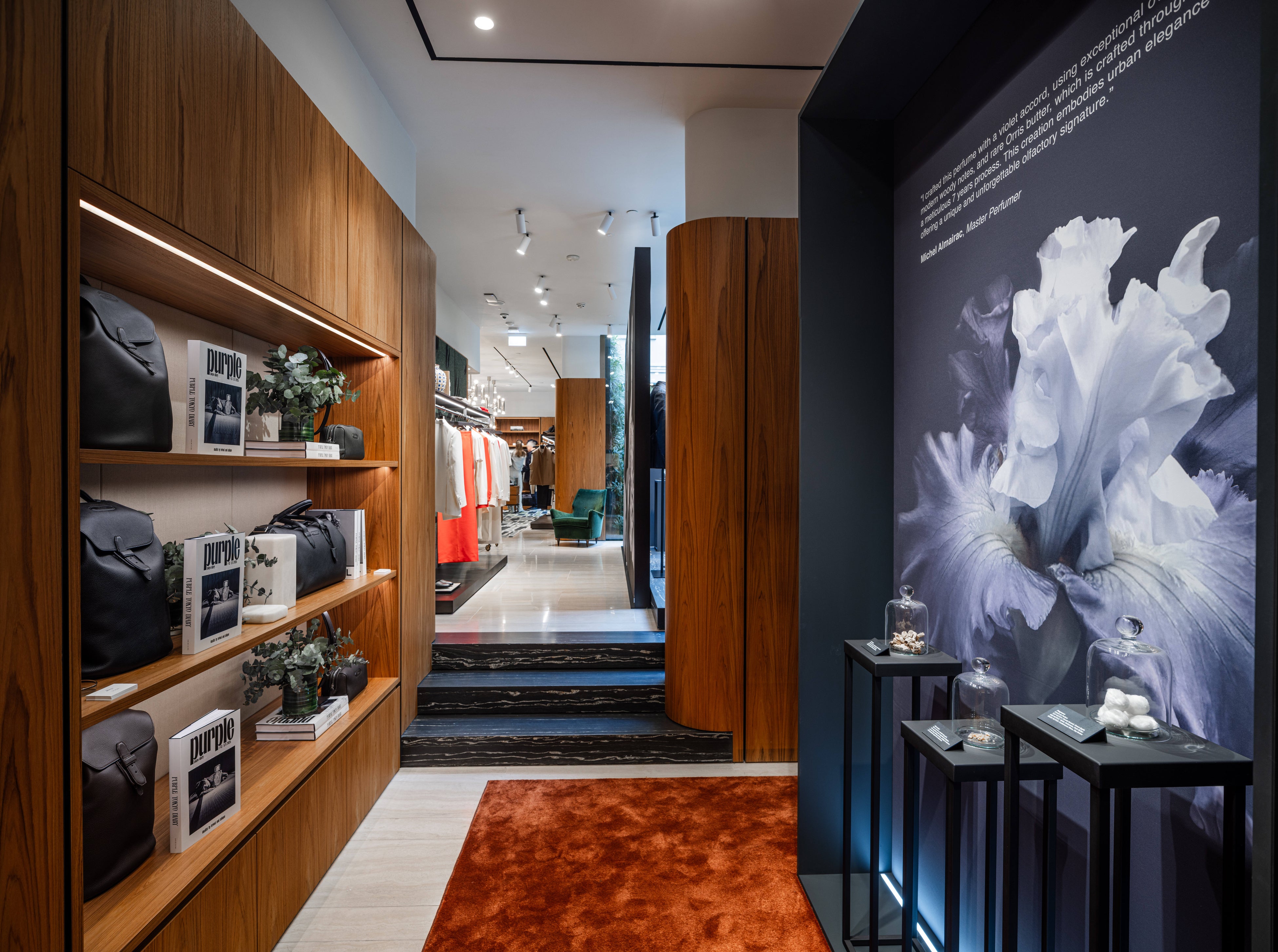 また、ブティック内には、フレグランスの世界観を表現したインスタレーションを展開。Purple Tokyo Diary #43の特別企画としてオリヴィエ・ザームが撮影したエディトリアルフォト、「シール・ペルデュ」製法を紹介する映像、ラリックのアイコニックなクリスタルのベースなどが展示され、空間全体が芸術的な雰囲気に包まれました。