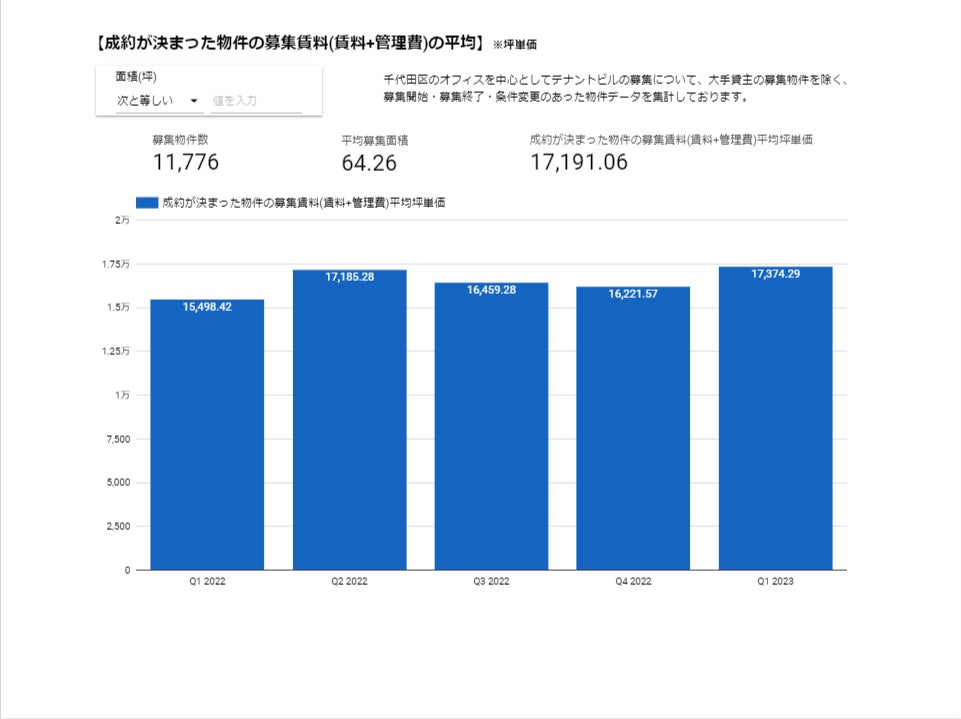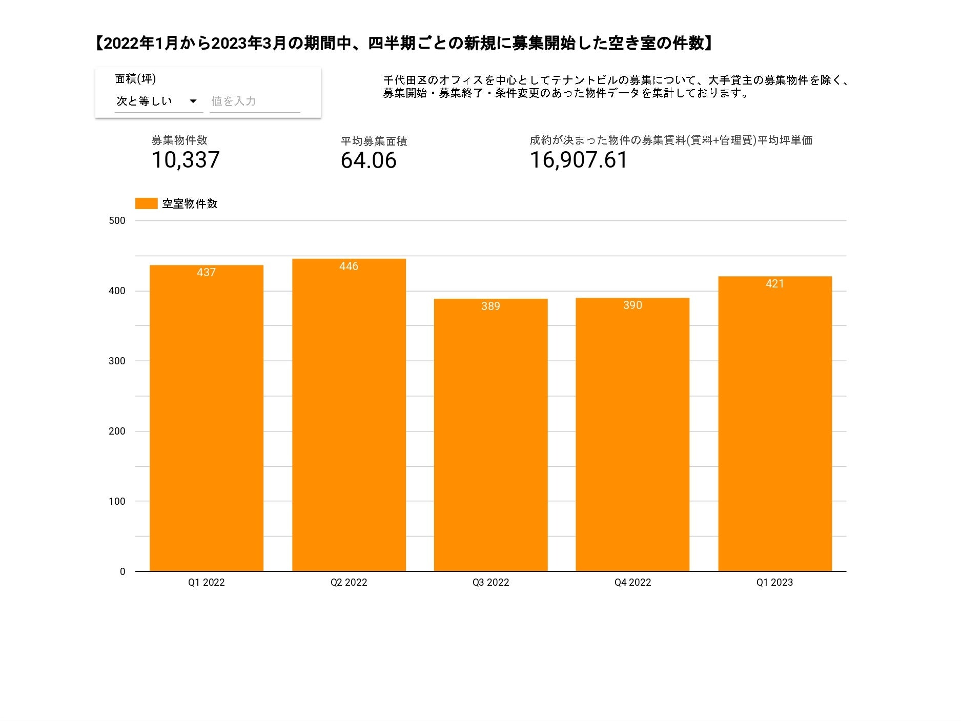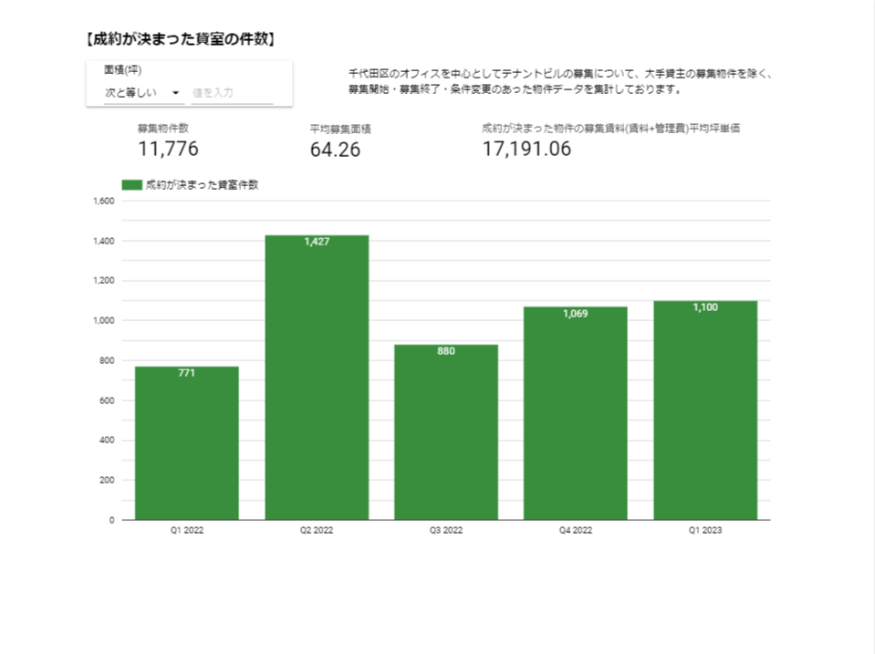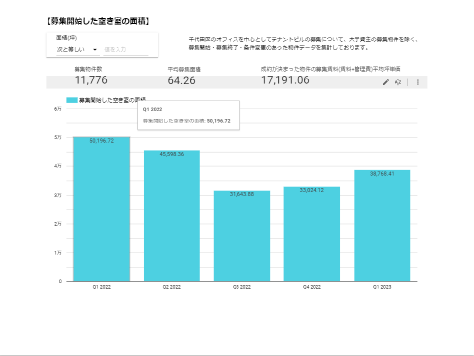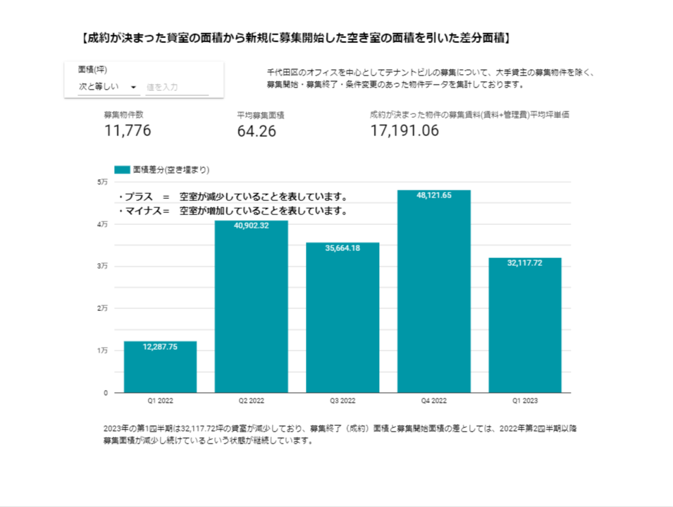 募集開始している貸出面積は、3四半期連続で上昇ではあるものの、2022年度第1四半期50,196坪の募集貸面積だったのに対し、38,768坪であり、市況感としては大きくは変わっていないと言える。