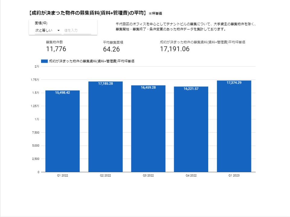 成約面積、件数が前期比で増加、値ごろ感のある物件の入居状況は比較的好調です。結果、競合物件が減少したことにより成約賃料の平均金額が引き上げられています。(下図参照)