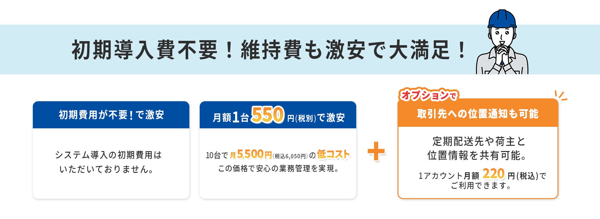 現在、導入が広がっている営業車両の動態管理システムですが、本体代や通信費で年間数万円の経費が発生するため、高くて導入できないという事業者様の悩みにお答えして、本サービスを開発しました。