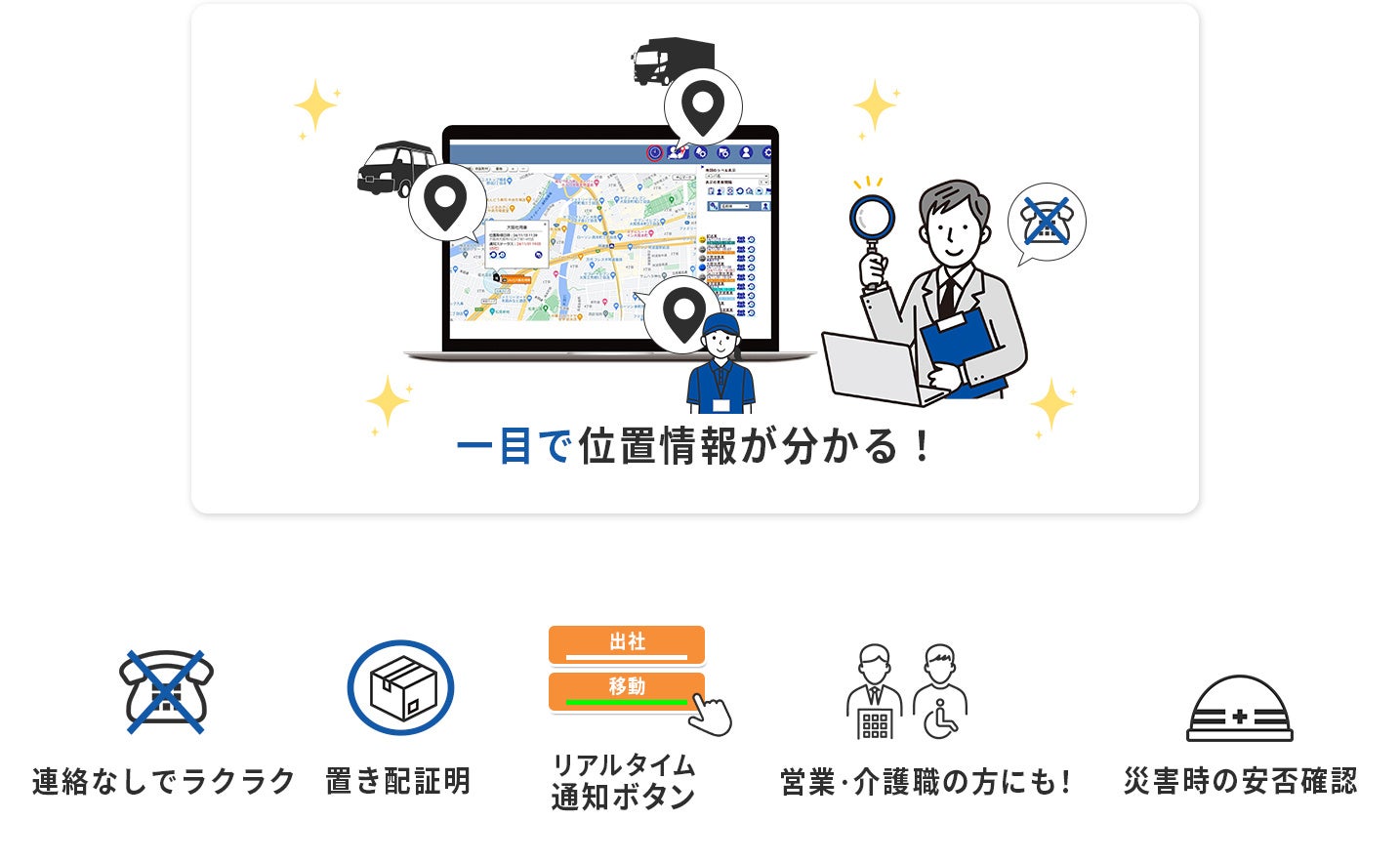 従業員が持っているスマートフォンにアプリをインストールするだけで、管理者様はPCなどで従業員の位置を確認できる様になり、運送業、保守・メンテナンス、訪問介護、営業など業種・業務問わずご利用いただけます!