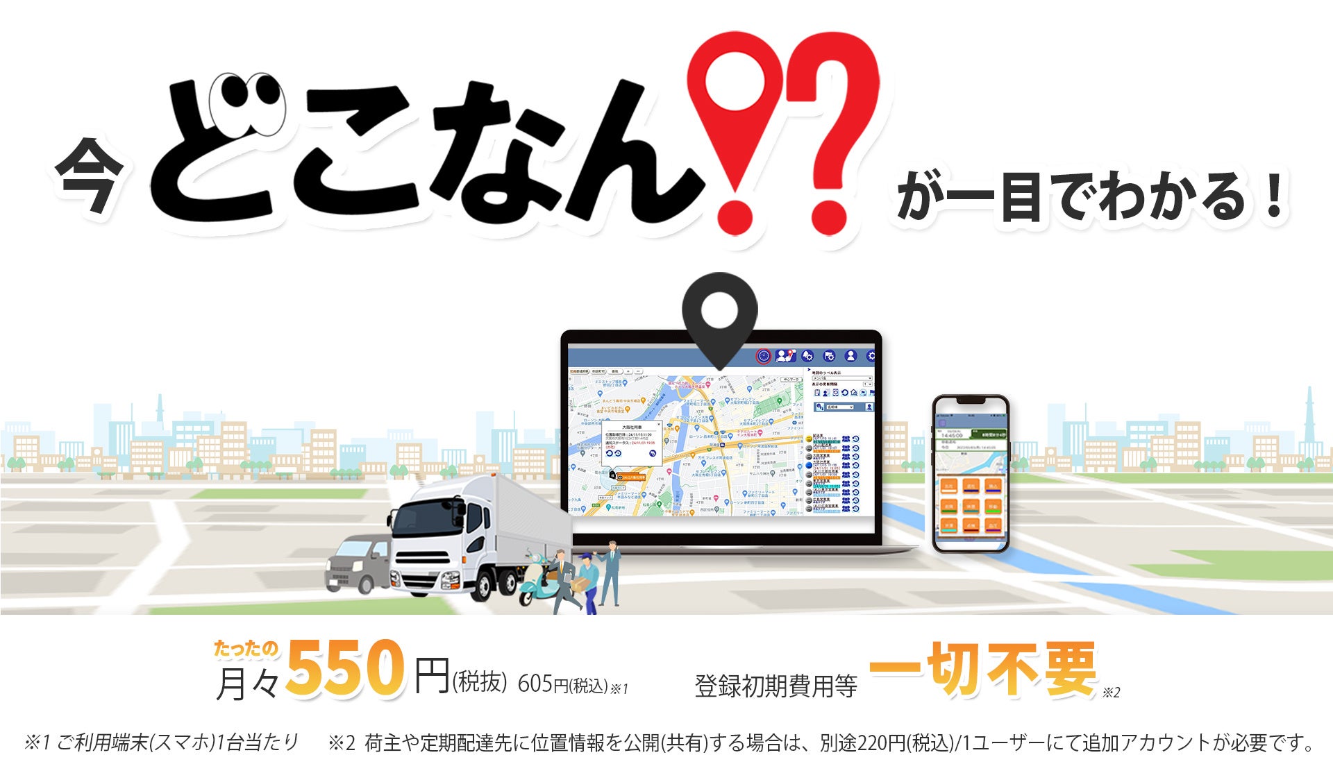 『どこなん!?』はお客様お手持ちのスマートフォンを使うので、本体価格0円、月額利用料は、携帯電話1台当たり税別550円(税込605円)でご利用可能です。