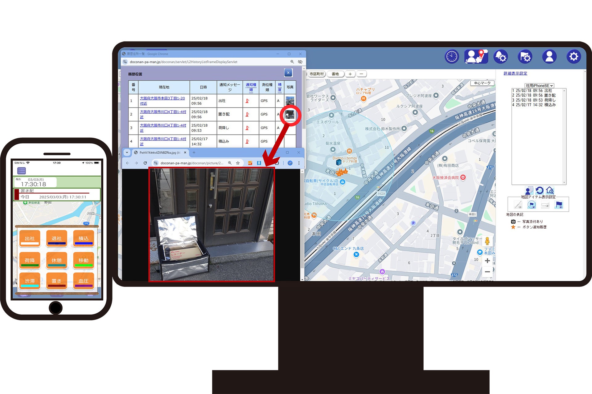 また、写真の添付も可能ですので、配達業務とうの配達完了や置き配照明、荷待ち時間や休憩時間の管理など、色々な用途に活用することができます。