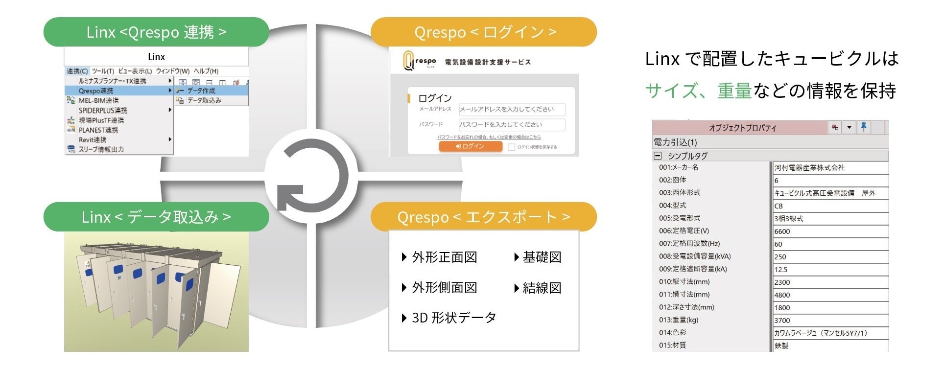 河村電器産業㈱社製 電気設備設計支援サービス「Qrespo」で自動設計されたキュービクルをLinx に配置できます。設計の初期段階でキュービクルのサイズや重量を確認することが可能です。