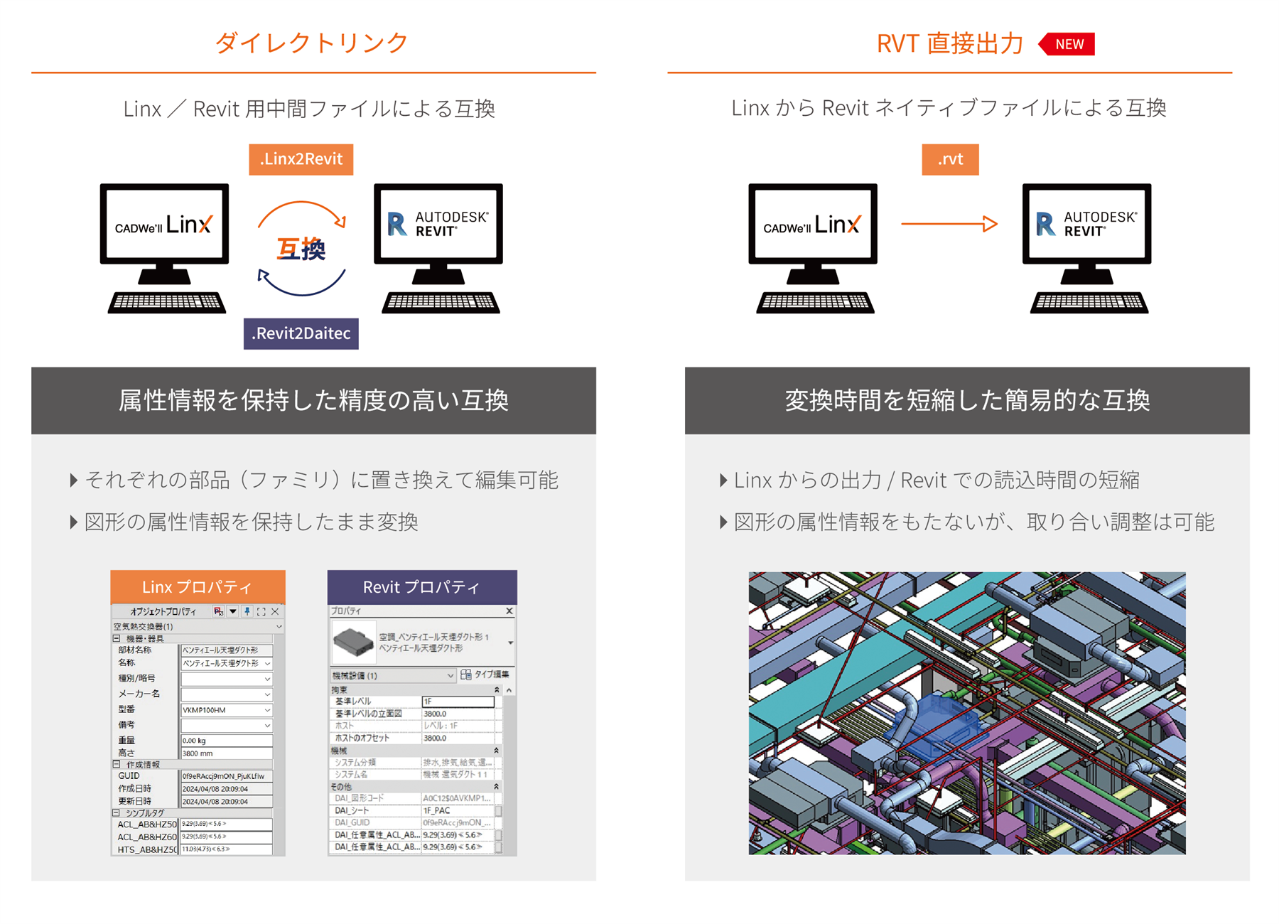 Autodesk®Revit® との相互連携により、シームレスなデータ受け渡しを可能にします。従来から提供しているプラグインを利用したファミリへのマッピング方式に加え、Revit ネイティブファイル(*.rvt) の直接出力が可能になりました。スピーディな取り合い調整により作業効率が向上します。