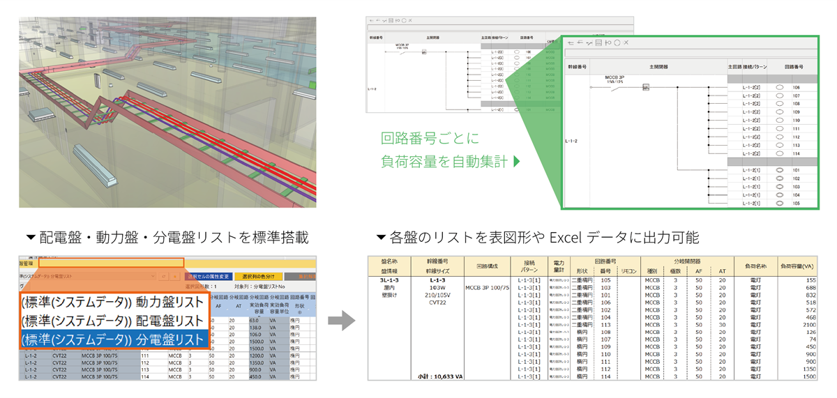 各盤に接続されている電気機器の負荷容量等を集計し、分電盤や動力盤等のリストを表やExcel データに出力できます。従来、モデルと別に作成していた各盤のリストは、モデルを元に管理することができます。