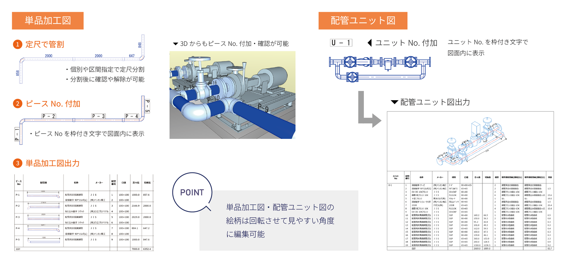 Linxでは配管加工機能を標準搭載しました。ピースNoやユニットNoを付加して配管加工帳票の作成ができます。加工図用の絵柄は回転させて見やすい角度に調整が可能です。