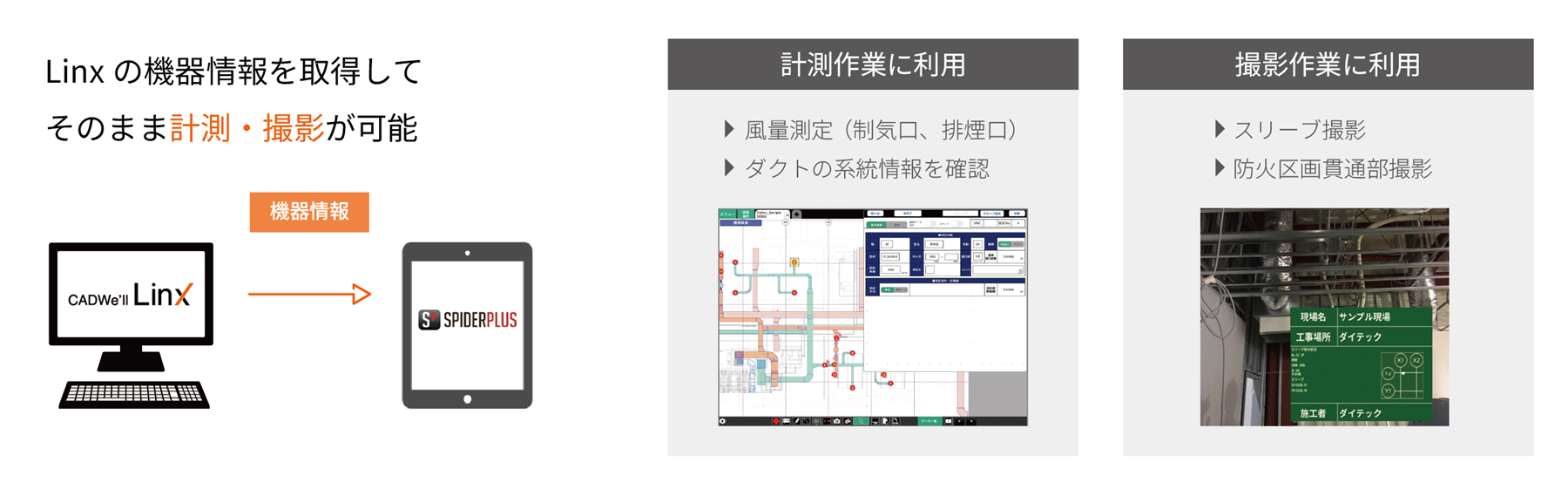 Linx で配置した機器情報をSPIDERPLUS ㈱社製「SPIDERPLUS」へ受け渡すことで、計測作業や撮影作業に利用することができます。また、 BIM 活用のオプション機能「S+BIM」との連携が実現し、Linx 図面をS+BIM で閲覧することが可能です。