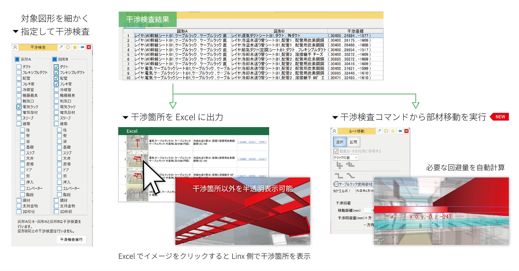 干渉検査機能により瞬時に干渉箇所を洗い出せます。干渉箇所は2D や3D上にアラート表示されるので一目瞭然。手戻りのない、正確な施工図作成をサポートします。