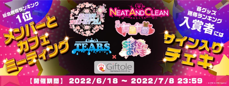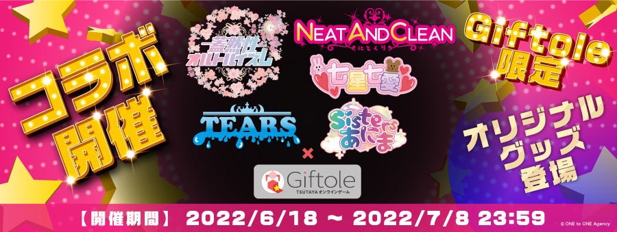 カルチュア・エンタテインメント株式会社(本社:東京都品川区/代表取締役社長 中西 一雄/以下、CE)が運営するオンラインクレーンサービス『TSUTAYA オンラインゲーム Giftole(ギフトーレ)』において、ONEtoONE Agency所属の4アイドルグループ「蓋然性オルトイズム」「Neat and clean.-ニトクリ-」「Sistersあにま」「TEARS」とソロアイドル「七星七愛」(株式会社ONEtoONE Agency 本社:東京都渋谷区)とのオリジナルコラボレーショングッズの登場と、コラボレーションを記念したイベントの開催をお知らせいたします。