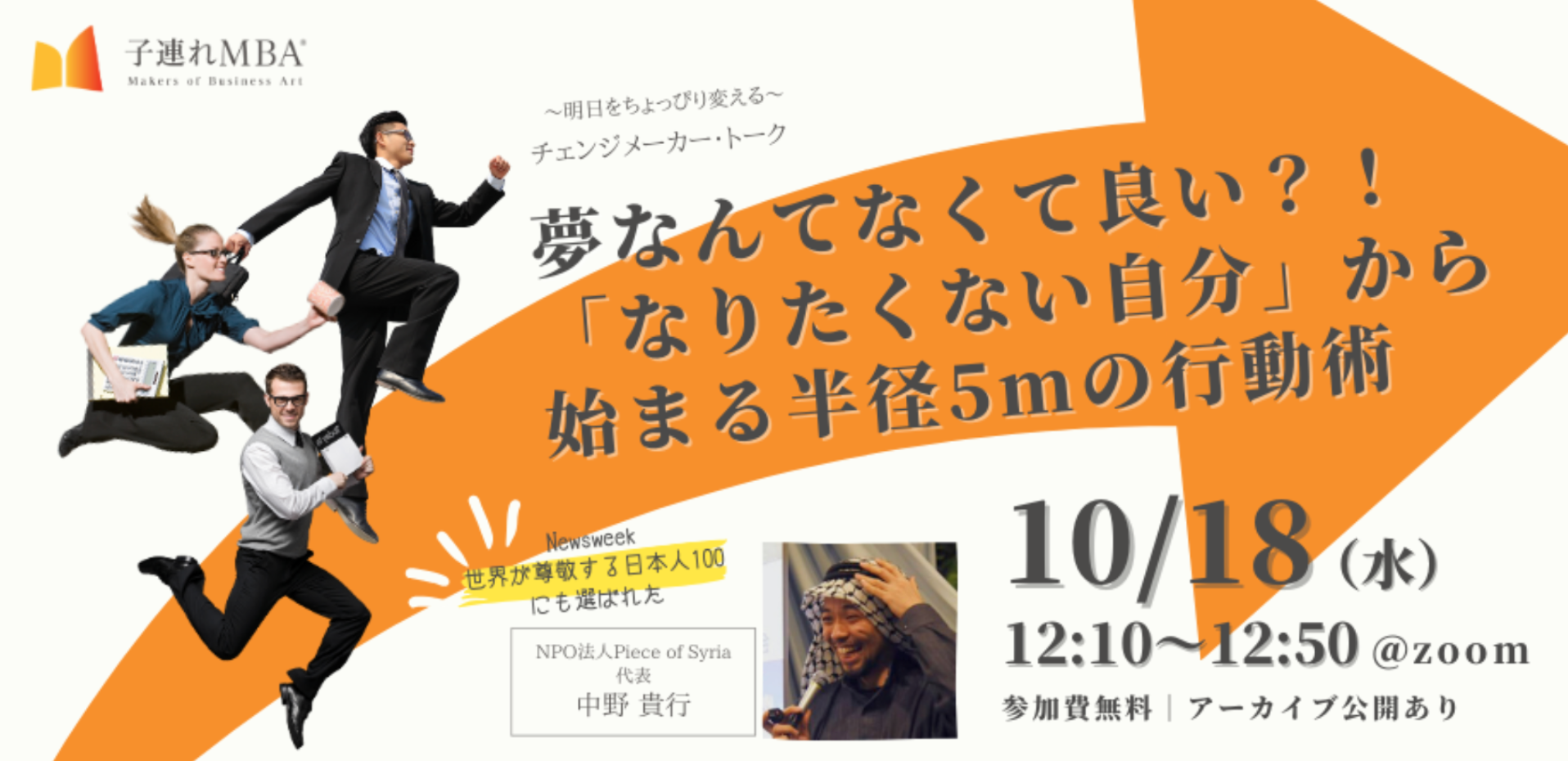 「夢なんてなくて良い?!『なりたくなる自分』から始まる半径5mの行動術」を、子育て世代を応援したいと願うPiece of Syria代表 中野貴行がお話しします。