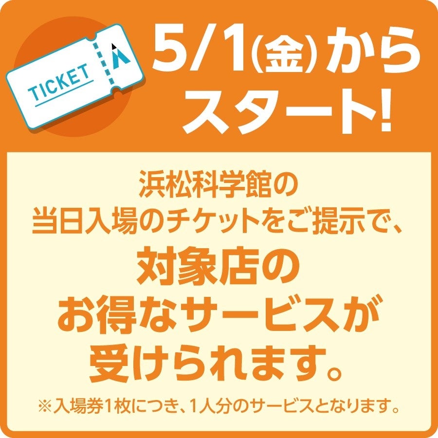 ■5/1スタート:浜松科学館の当日入場のチケットをご提示で、ソフトドリンクサービスや割引など、対象店のお得なサービスを受けられます。