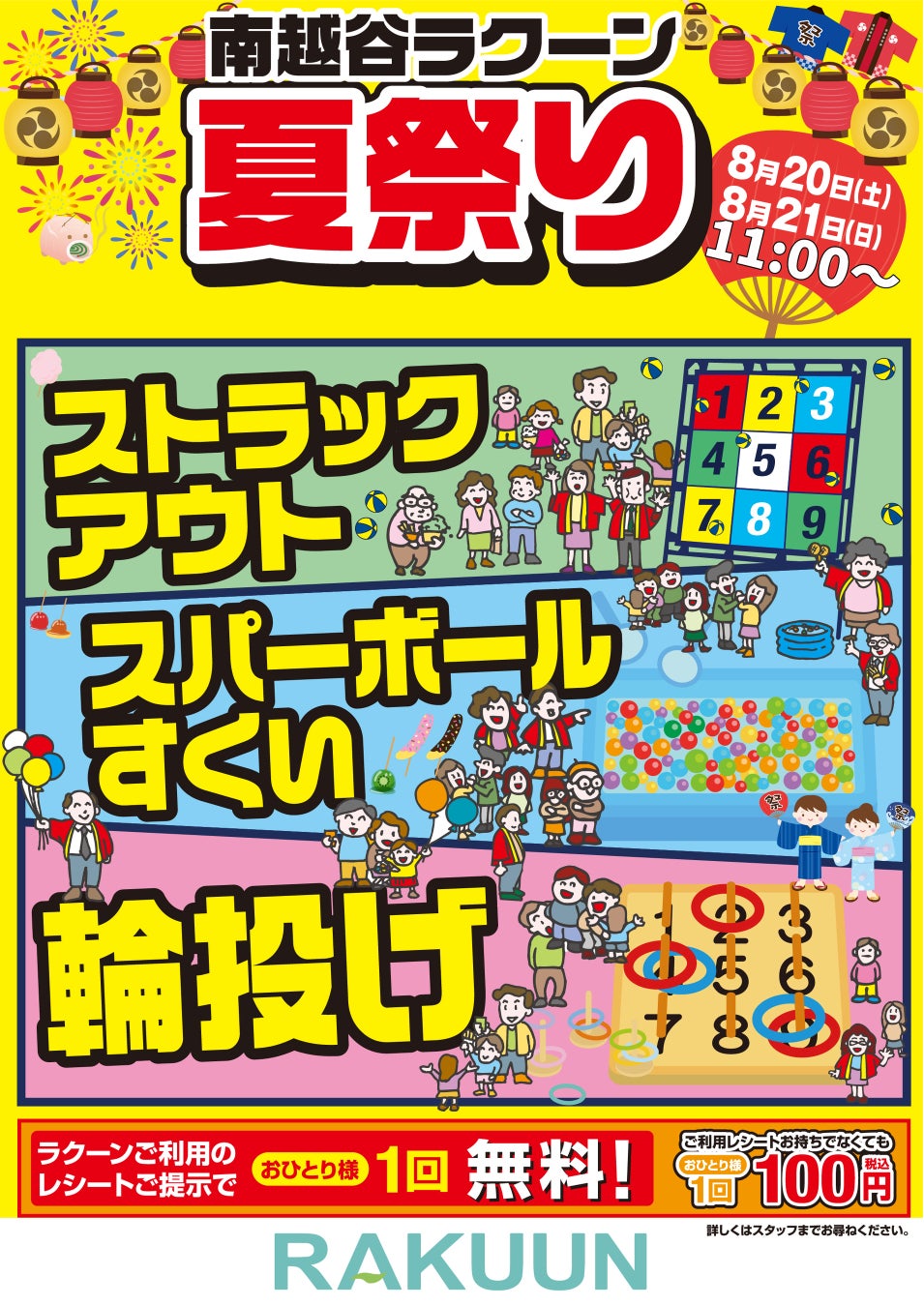 参加条件:南越谷ラクーンテナントご利用のレシート、または南越谷ラクーン内の各テナント会員証ご提示で、お一人様1回無料。レシート・会員証をお持ちでなくとも、お一人様1回100円(税込)で参加可能。