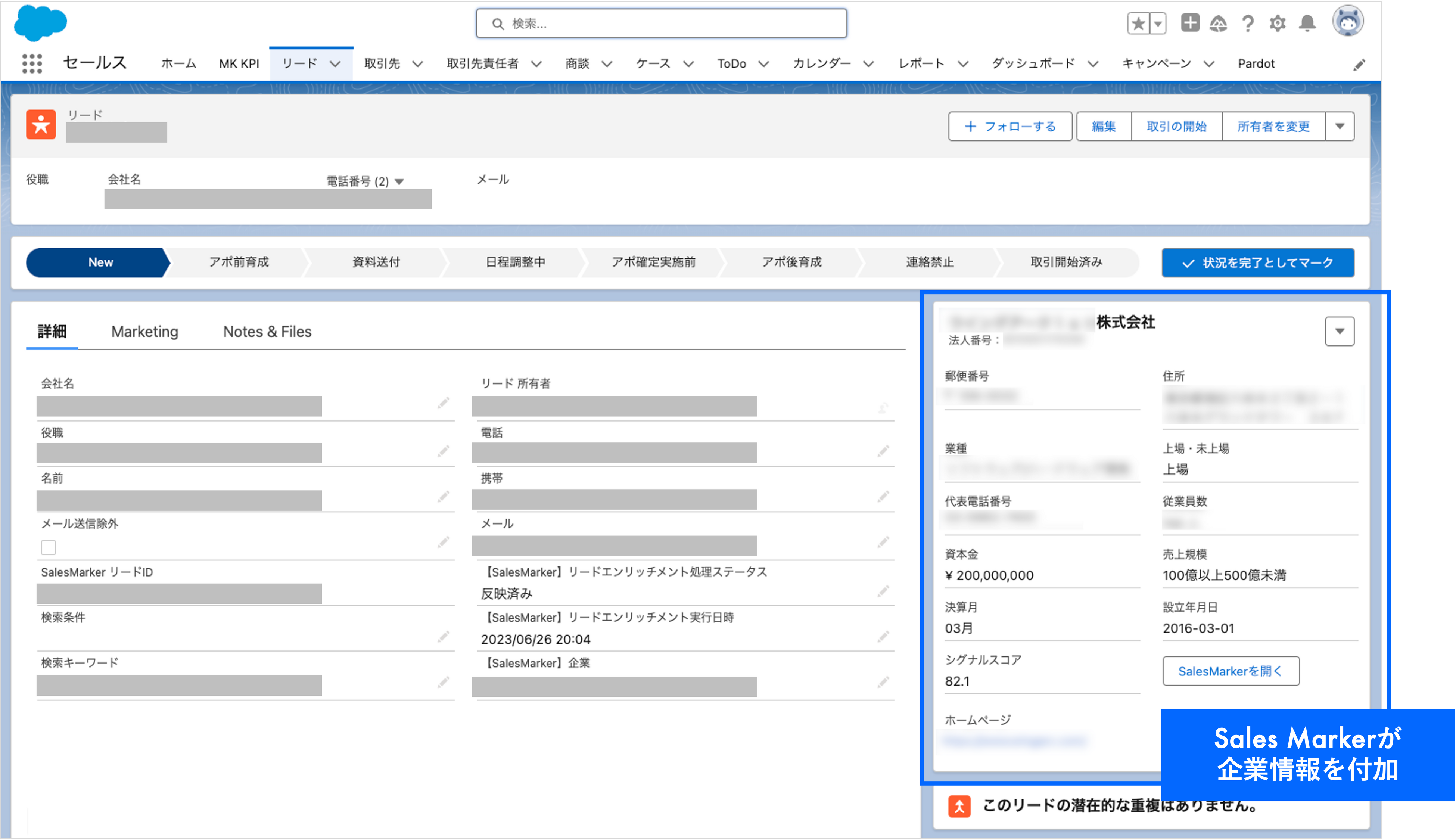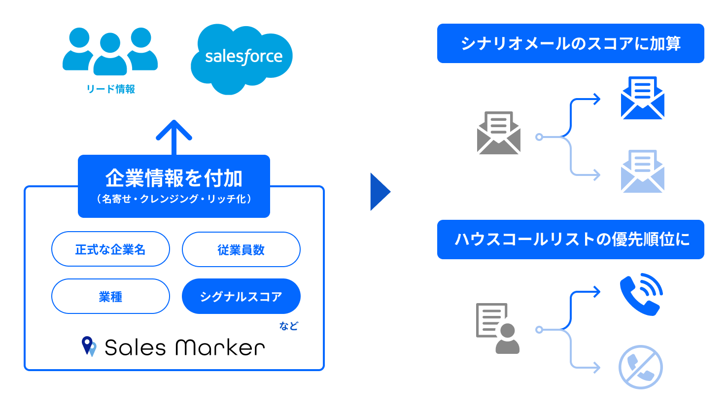 Sales MarkerとSalesforceの連携による「リードエンリッチメント」機能は、Salesforce上でリードの作成や更新を行った際に、Sales Markerがもつ約500万法人の企業データベースをもとにした高精度な企業名の名寄せや、正規化のほか、各種企業情報を該当リードへ付加する機能です。これにより、獲得リードの自動的なターゲット判定はもちろん、ABM(Account Based Marketing)などのターゲティング戦略において、自社がリーチできていない企業を特定することにも活用できます。また、企業のインテント(興味関心の高さ)をもとにした「シグナルスコア」もSalesforceに連携されるため、MAツールのナーチャリングスコアに組み込むことでシナリオメールの判定基準にしたり、ハウスリストへのコールドコールの優先順位づけに役立てることも可能です。