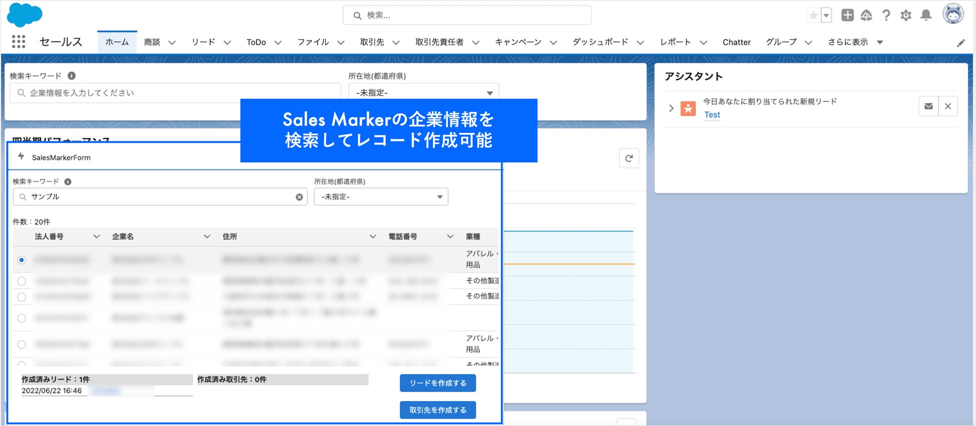 「Sales Marker Form」機能では、企業名や法人番号などの企業情報からSales Marker内の企業情報を呼び出し、リードや取引先として新規レコードを作成することができ、以下のシーンで効果的に活用できます。