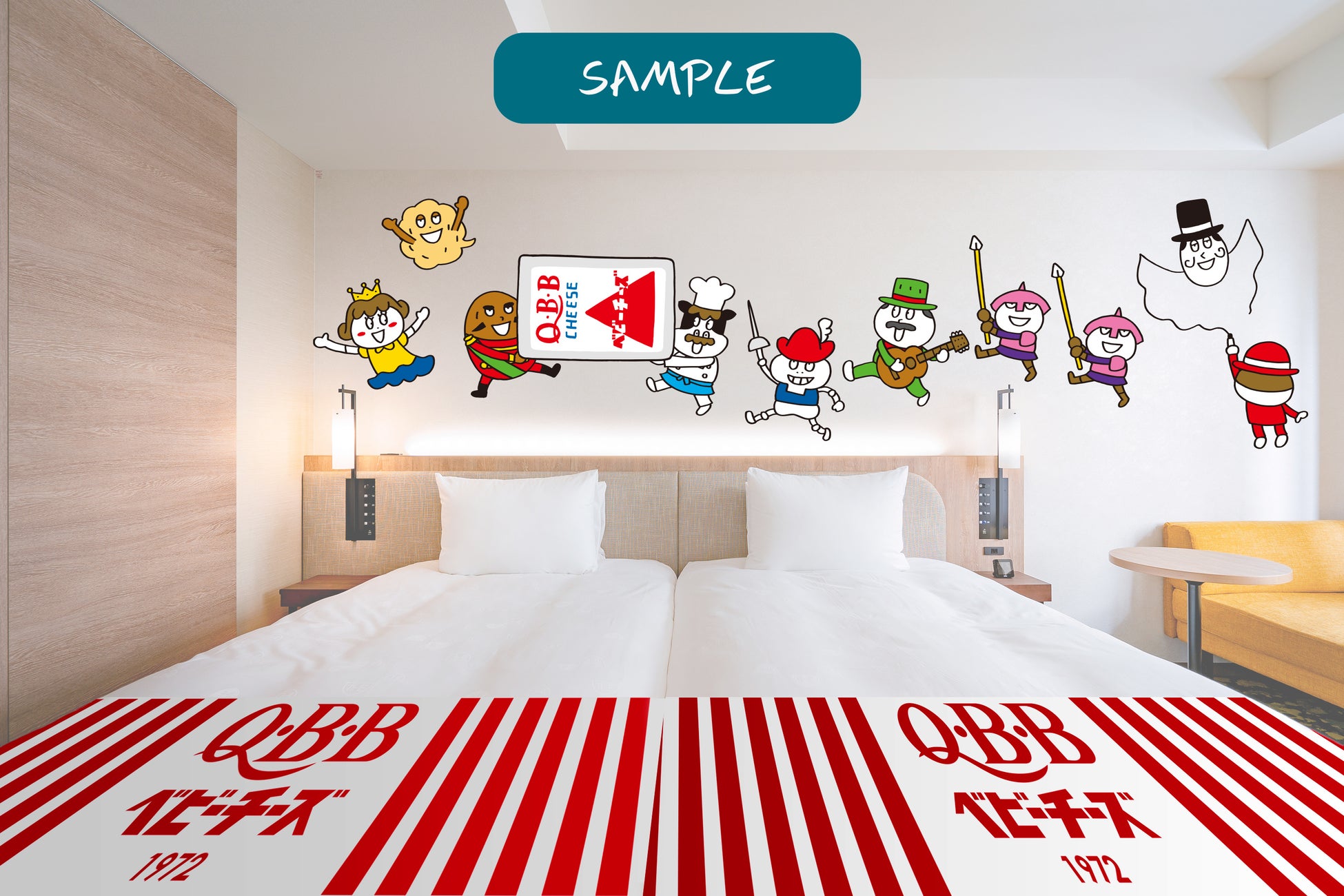 「QBBベビーチーズ」コラボルームでは、Qちゃんの生みの親、イラストレーター、THE ROCKET GOLD STAR山崎秀昭氏が今回のために描きおろした「Qちゃんとゆかいな仲間たち」が壁に描かれており、ベッドにはQBBベビーチーズのロゴをあしらっています。また、宿泊者には、「QBBベビーチーズグッズ」、「「QBB ベビーチーズ」×キャンバス 神戸三宮 コラボ T シャツ」、「キャンバスラウンジでベビーチーズ 3 種とビール」といったプレゼントやおもてなしもご用意しております。