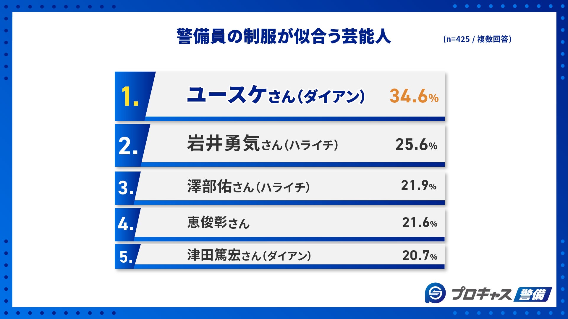 最後に「警備員の制服が似合う」と思う芸能人は誰かをたずねたところ、お笑い芸人のダイアン「ユースケさん」が1位となりました。