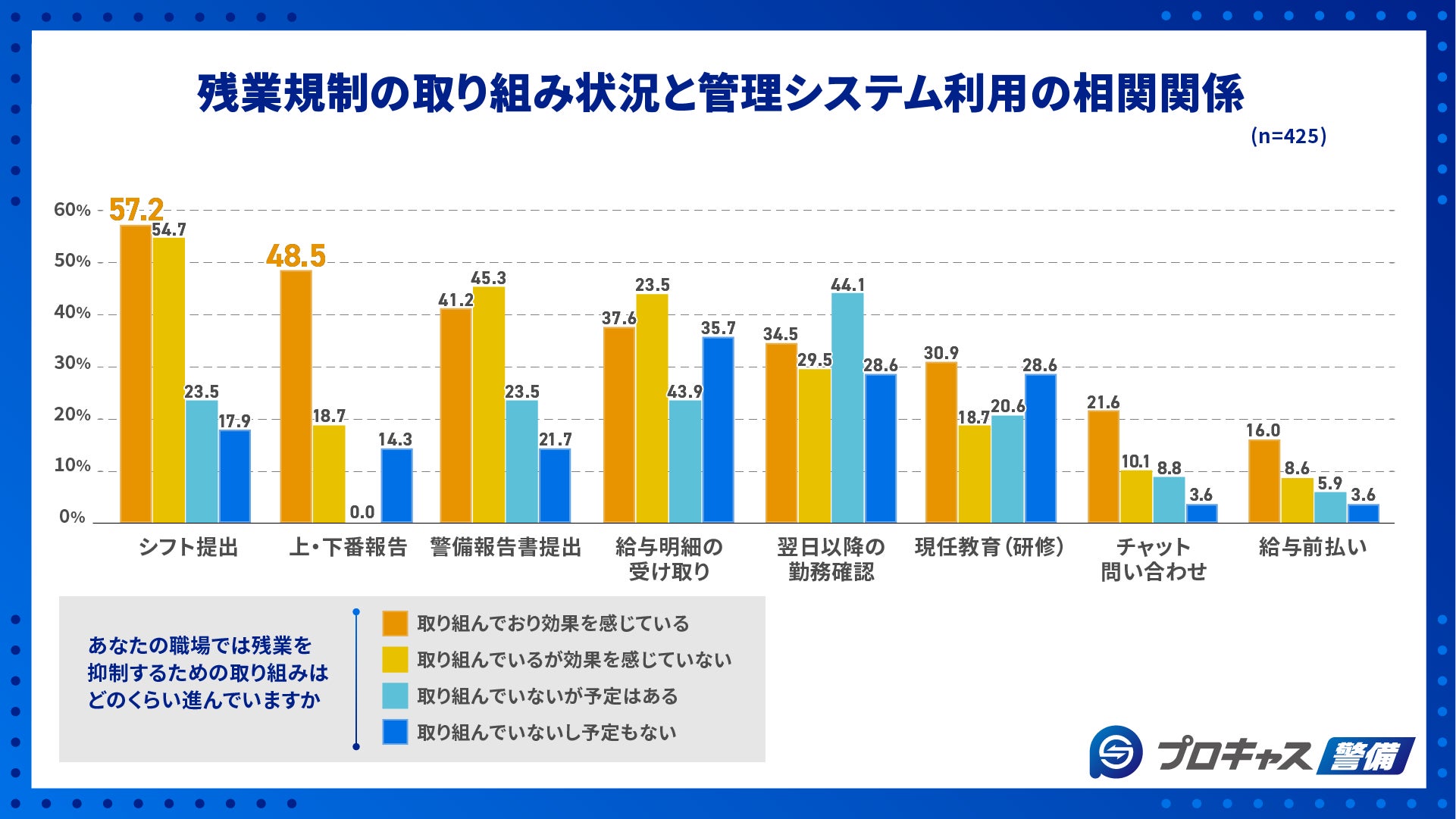 「プロキャス警備」などシステム開発事業を行う株式会社PROCAN(本社:東京都中央区、代表取締役:若村和明)は、20代以上の警備業就業者425人を対象に、意識調査をインターネットリサーチにて実施いたしました。この結果から、「残業規制の取組効果を実感している(45.6%)」と回答した人の約5割の職場ではシフト提出や勤怠報告に専用の管理システムを導入していることが明らかとなりました。