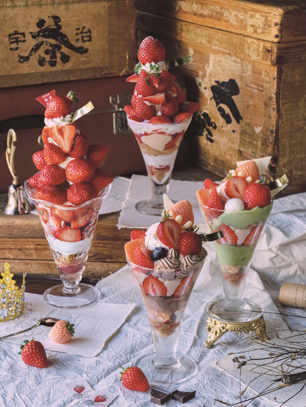 濃厚な抹茶アイスとクリームにカスタードや爽やかないちごアイスを重ね、福岡県産あまおうと奈良県産淡雪いちごを贅沢にトッピング。