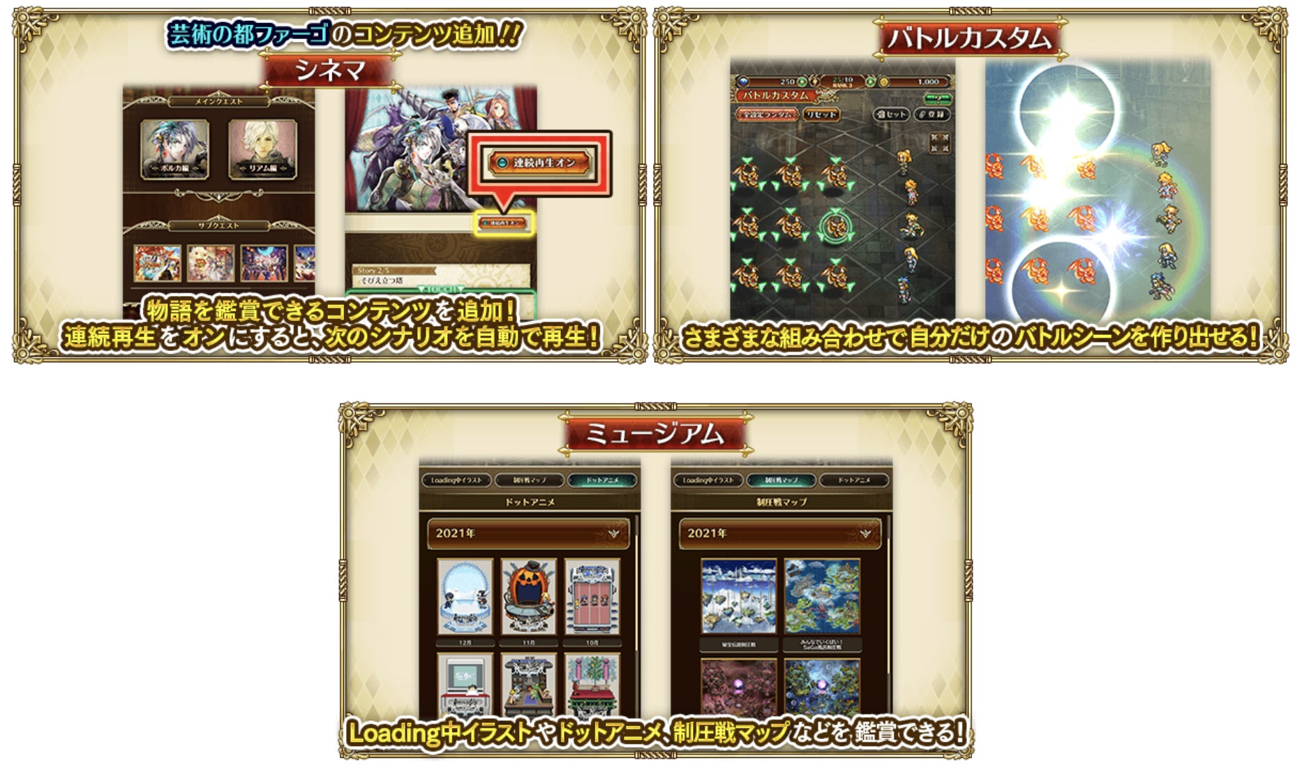 芸術の都ファーゴに「シネマ」「バトルカスタム」「ミュージアム」の3つの新コンテンツを追加しました。