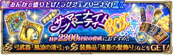 イベントクエストクリアでドロップするサマーナイトパーティーBOXガチャチケット[期間限定]を集めてイベントBOXガチャに挑戦すると、SS弓武器「風涼の清弓」やSS装飾品「清夏の髪飾り」などが獲得できます。