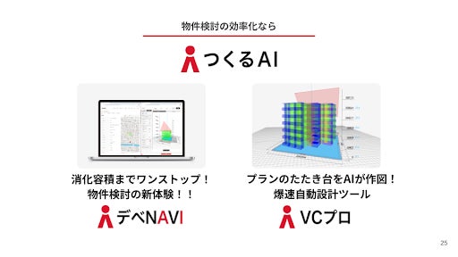 当社はボリュームチェックの自動化をはじめとした、営業マンが机に向かってやらねばならない各種調査や計算を、AIを活用して一元収集することで、営業マンを事務作業から解放し、商談時間を増やし、より多くの案件情報にアクセスできるようにする業務効率化SaaS、「つくるAI デベNAVI」「つくるAI VCプロ」を開発しています。