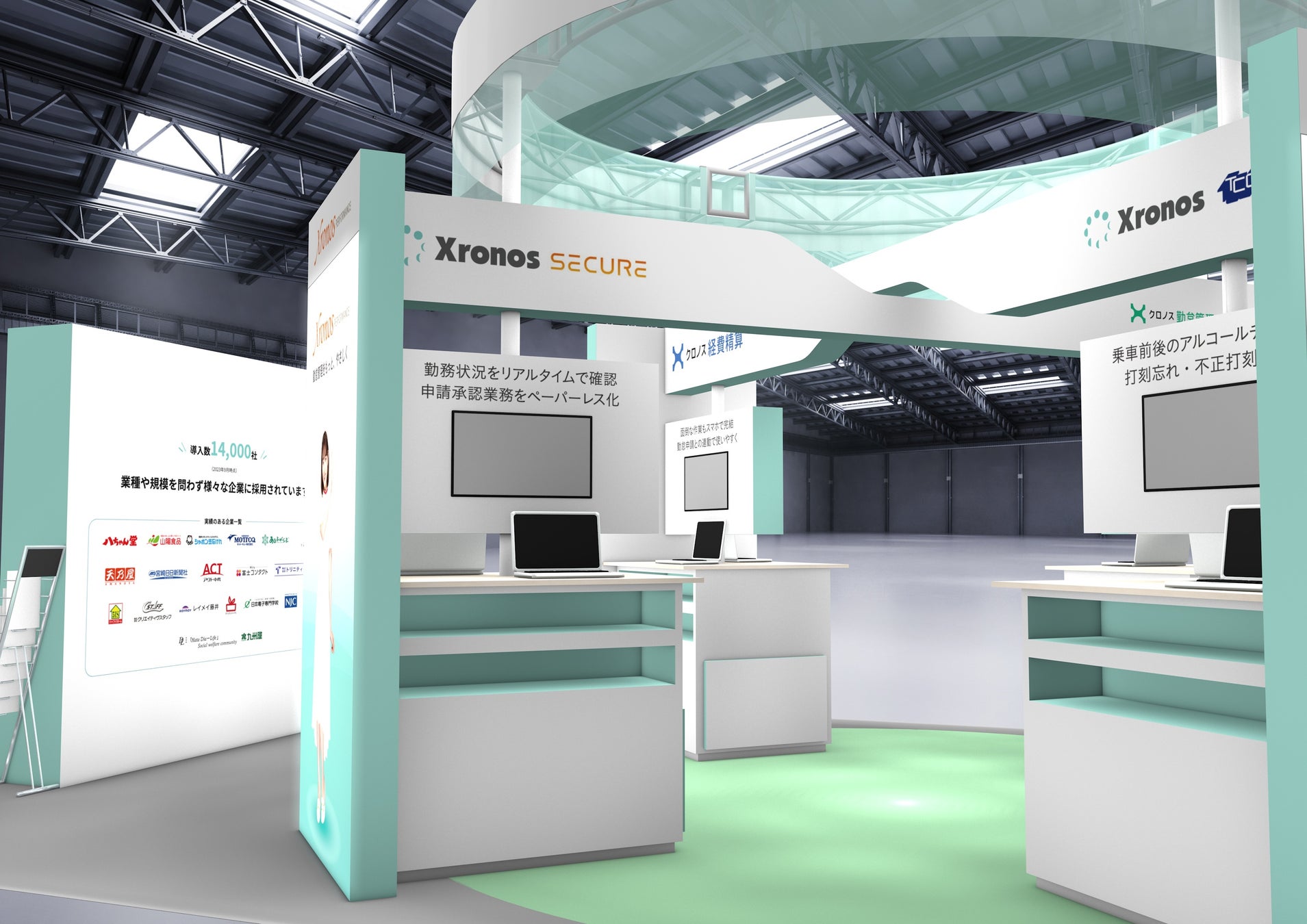 展示会場では「やさしい勤怠クロノス」をコンセプトに、実際にクロノスの勤怠管理システムを見て触って、ご体感いただける展示品をご用意しています。